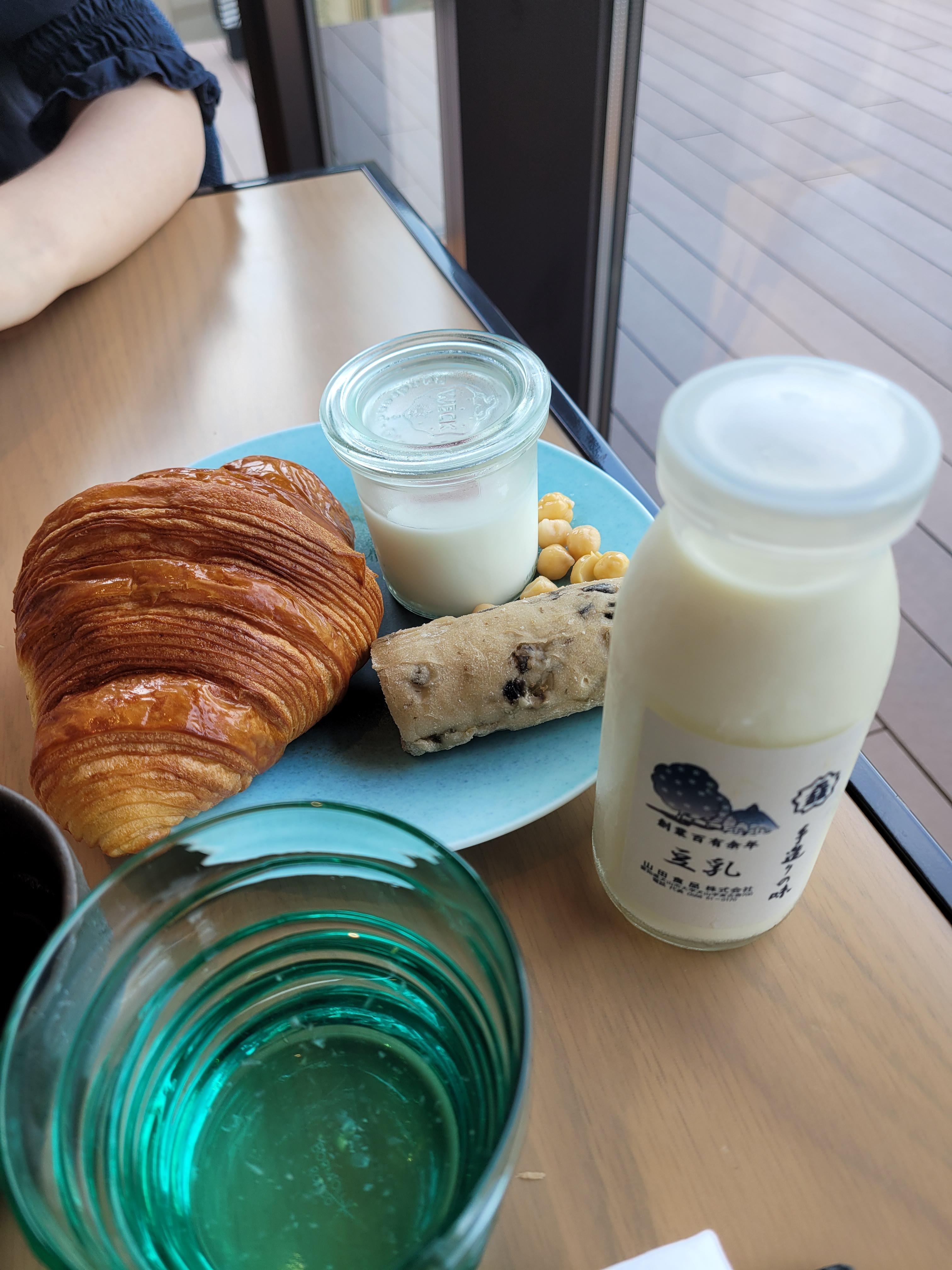 남편이 담아온 메뉴입니다. 곤트란쉐리에 크루아상이라는데 남편 말로는 기대했던 것 보다는 맛이 없다고 하더라고요. 두유는 인근 지역에서 생산한 두유로 정말 콩 100% 함유된 맛이었습니다. 단 맛은 전혀 없고 콩국수를 만들어 먹으면 좋을 것 같은 맛이랄까요? 중국 또우장 느낌입니다.