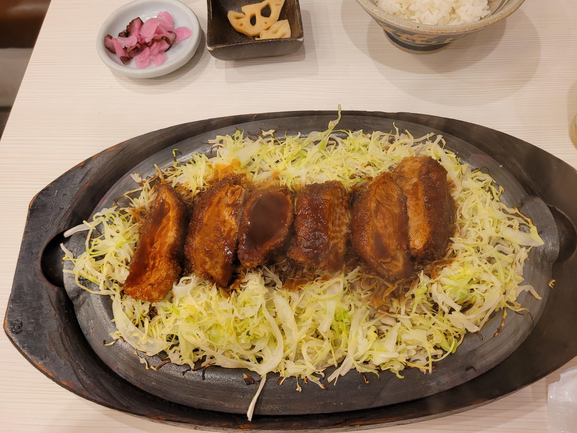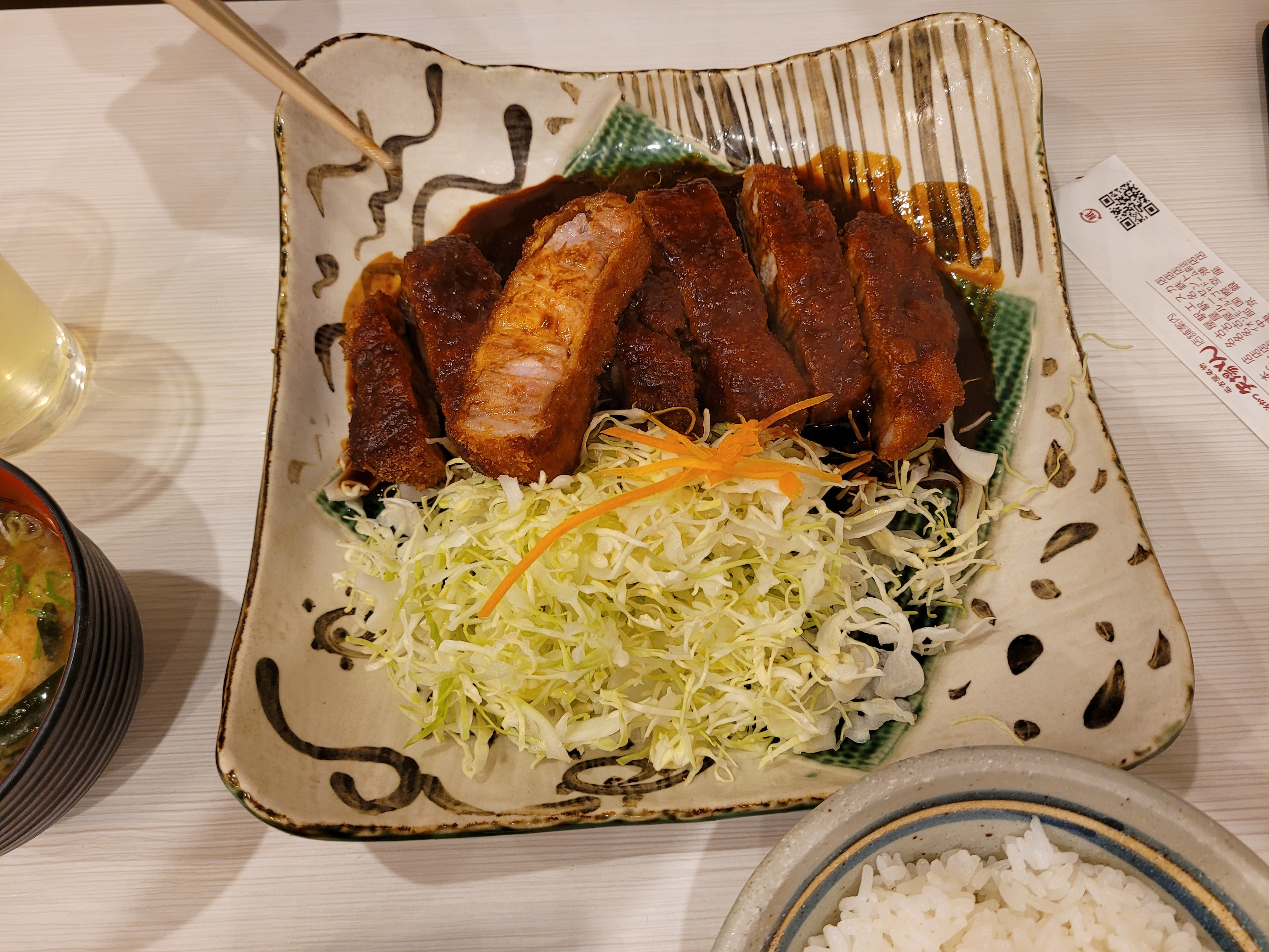 다음은 제가 주문한 일반 미소카츠입니다. 철판 미소카츠와 소스는 동일하나 고기가 다릅니다. 고기 육즙이 살아있으니 아무래도 비계가 있는데, 삼겹살보다는 지방이 적지만 목살보다는 지방이 많아요. 된장소스가 돈까스에 어울릴까 걱정을 했는데 일반 돈까스 소스보다는 맛이 없지만 별미로 먹을만 한 정도였습니다. 나고야에 온다면 한 번 정도 먹어볼 만 하달까요? 된장 소스라고 짠맛을 생각했는데 살짝 달큰하기도 하면서 짭잘합니다. 뒷 맛이 조금 텁텁해요. 된장 맛이 은은하게 느껴지긴 합니다. 고기 자체가 워낙 맛있어서 소스 없이 일반 돈까스로 먹어보면 어땠을까 싶었어요. 철판 미소카츠를 먹은 남편은 철판 미소카츠가 따끈하게 먹을 수 있고 양배추에 소스가 배어있어 더 맛있다고 했습니다. 저는 제가 주문한 일반 미소카츠가 맛있었고요.