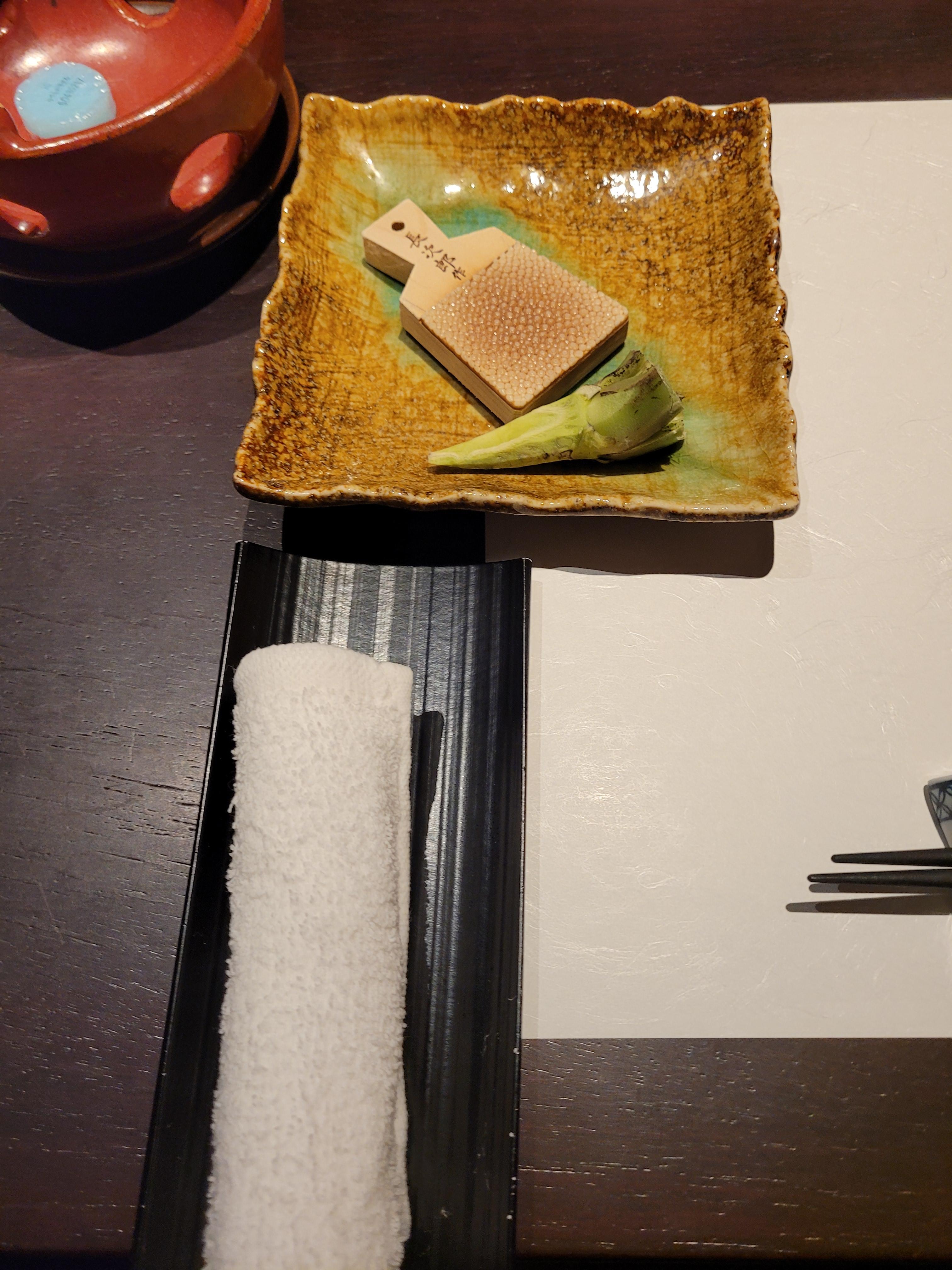이제 본격적인 가이세키 요리가 시작되었습니다. 로스트 비프 연어 말이가 에피타이저로 제공되었는데요. 저는 익힌 소고기를 좋아하는지라...처음부터 맛있게 먹지는 못했어요ㅋㅋㅋㅋ굳이 로스트 비프와 연어를 함께 말았어야 했나.. 싶은 맛이었습니다. 플레이팅이 굉장히 고급스러워서 대접받는 느낌은 들었어요. 맛을 중화시키기 위해 와사비를 많이 얹어 먹었습니다.