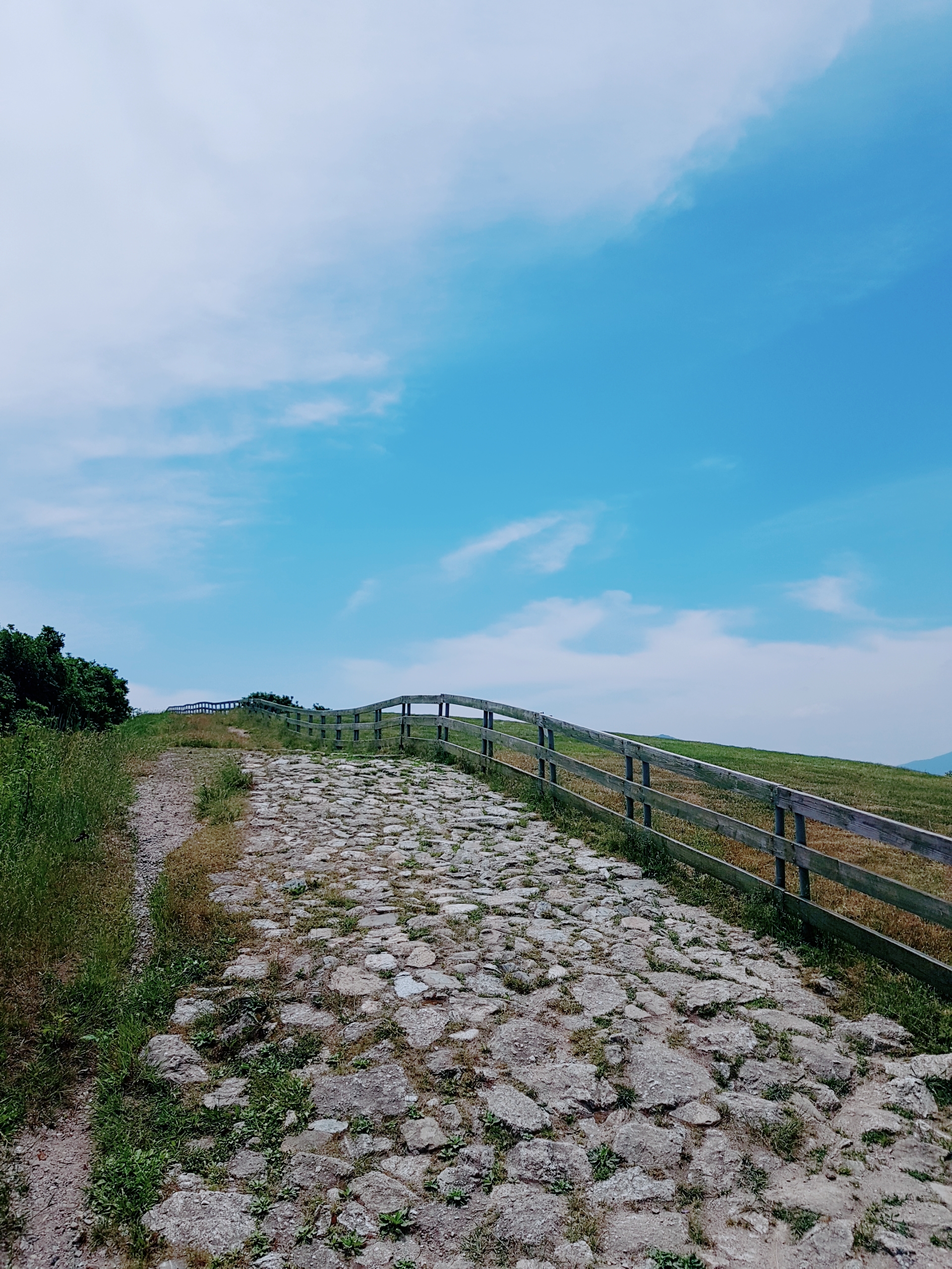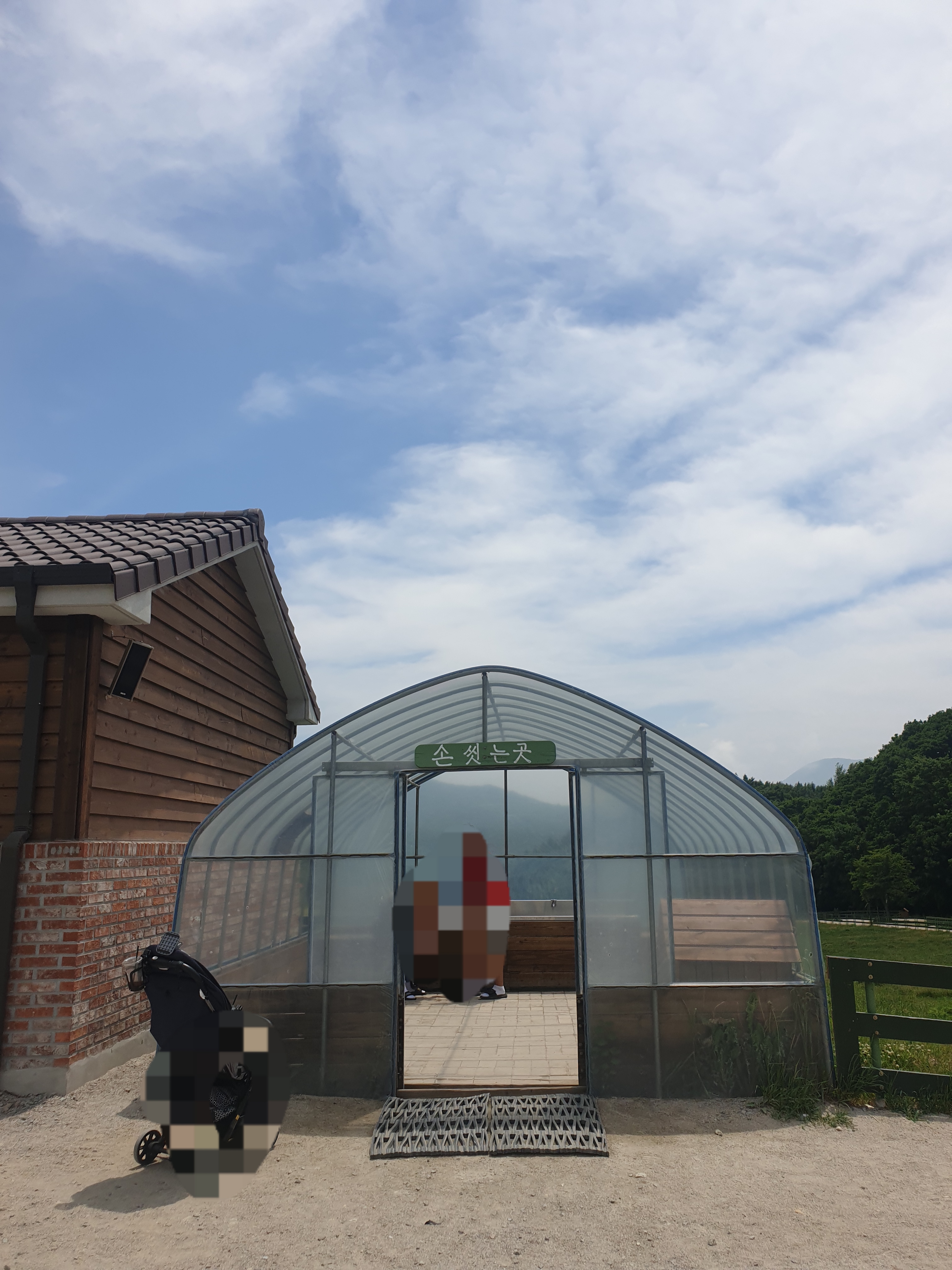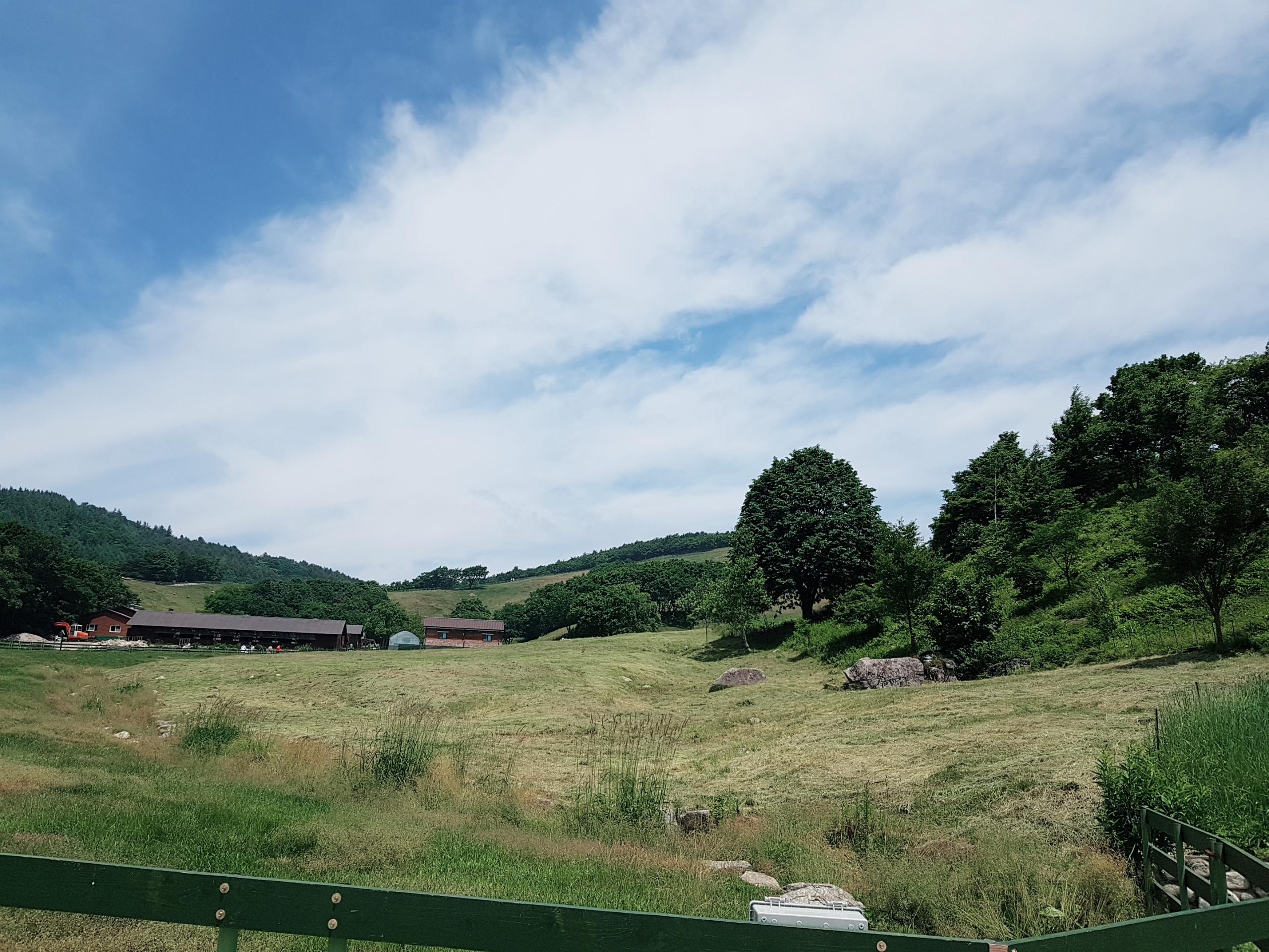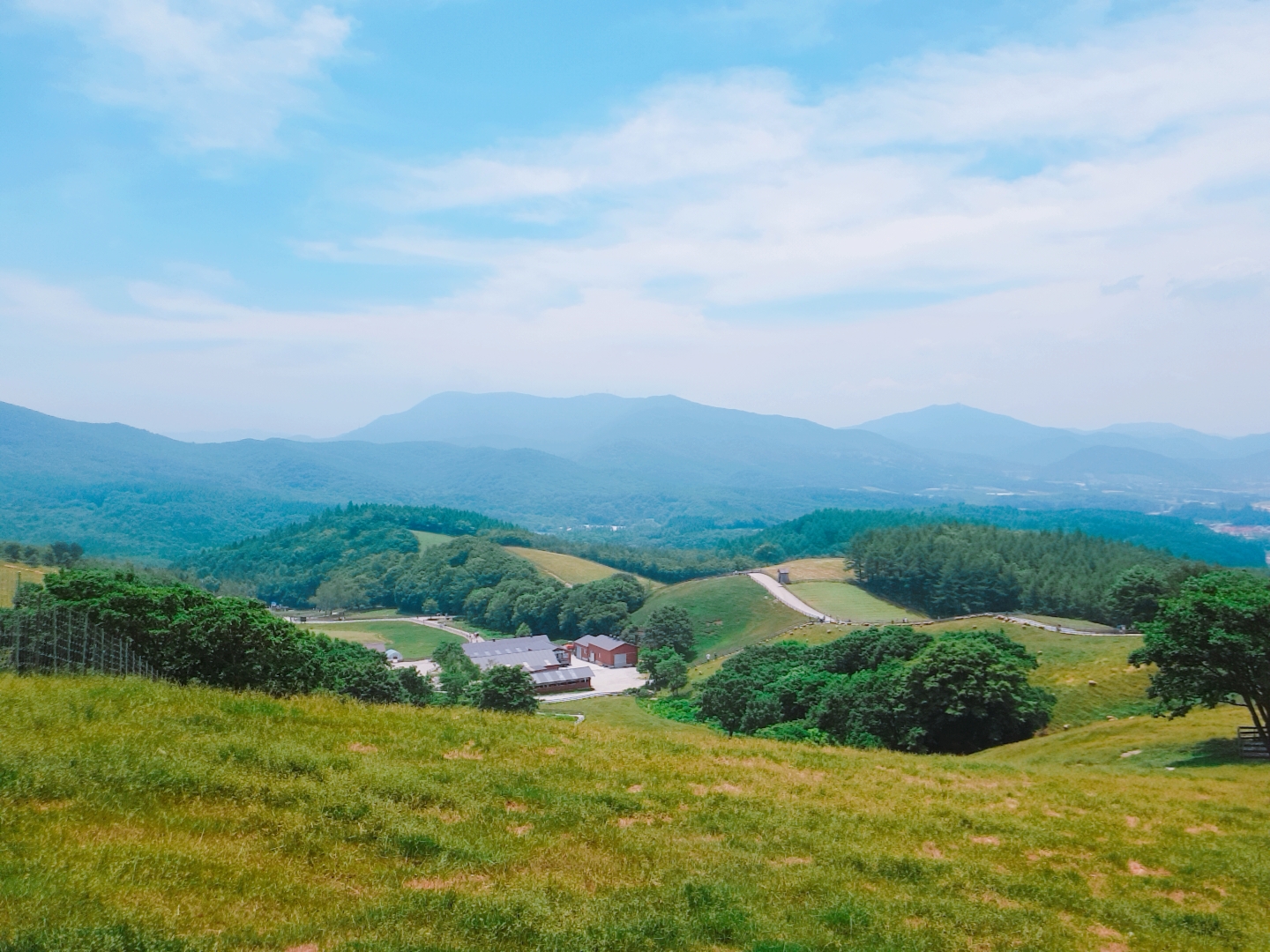 정상으로 올라가면 더 높은 고도에서 대관령 하늘을 한 눈에 조망할 수 있어요. 날씨가 정말 환상적이어서 사진 찍기 참 좋았습니다. 사진을 여러 장 찍고 언덕을 내려왔어요. 내려가는 길은 좀 덥기도 해서 후다닥 먹이주기 체험장으로 이동했어요.