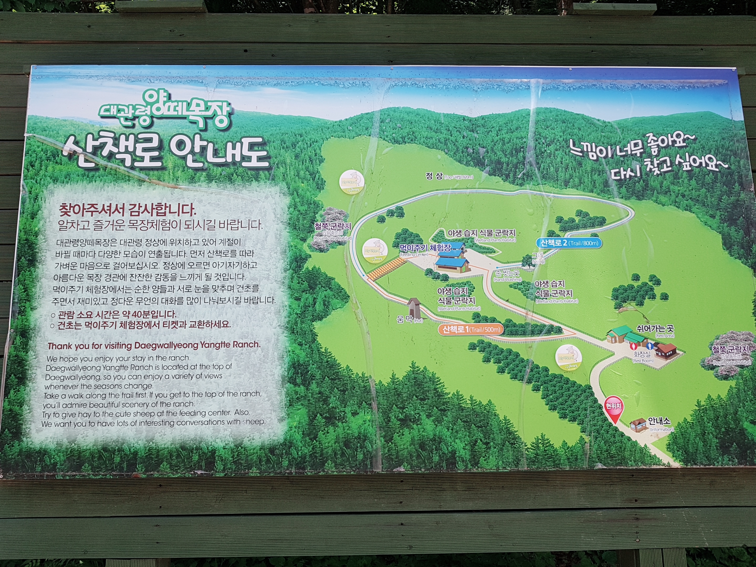 산책로 안내도인데요. 관람 소요 시간은 도보로 약 40분입니다. 저희는 1시간 좀 넘게 걸렸고, 삼양목장 홈페이지를 찾아보니 도보코스는 2시간 걸린다고 하네요. 저희는 양떼목장에 1시간 반 정도 있는 걸 계획으로 했기 때문에 딱 적당했어요. 계획에 맞춰서 목장을 고르시면 될 것 같아요.