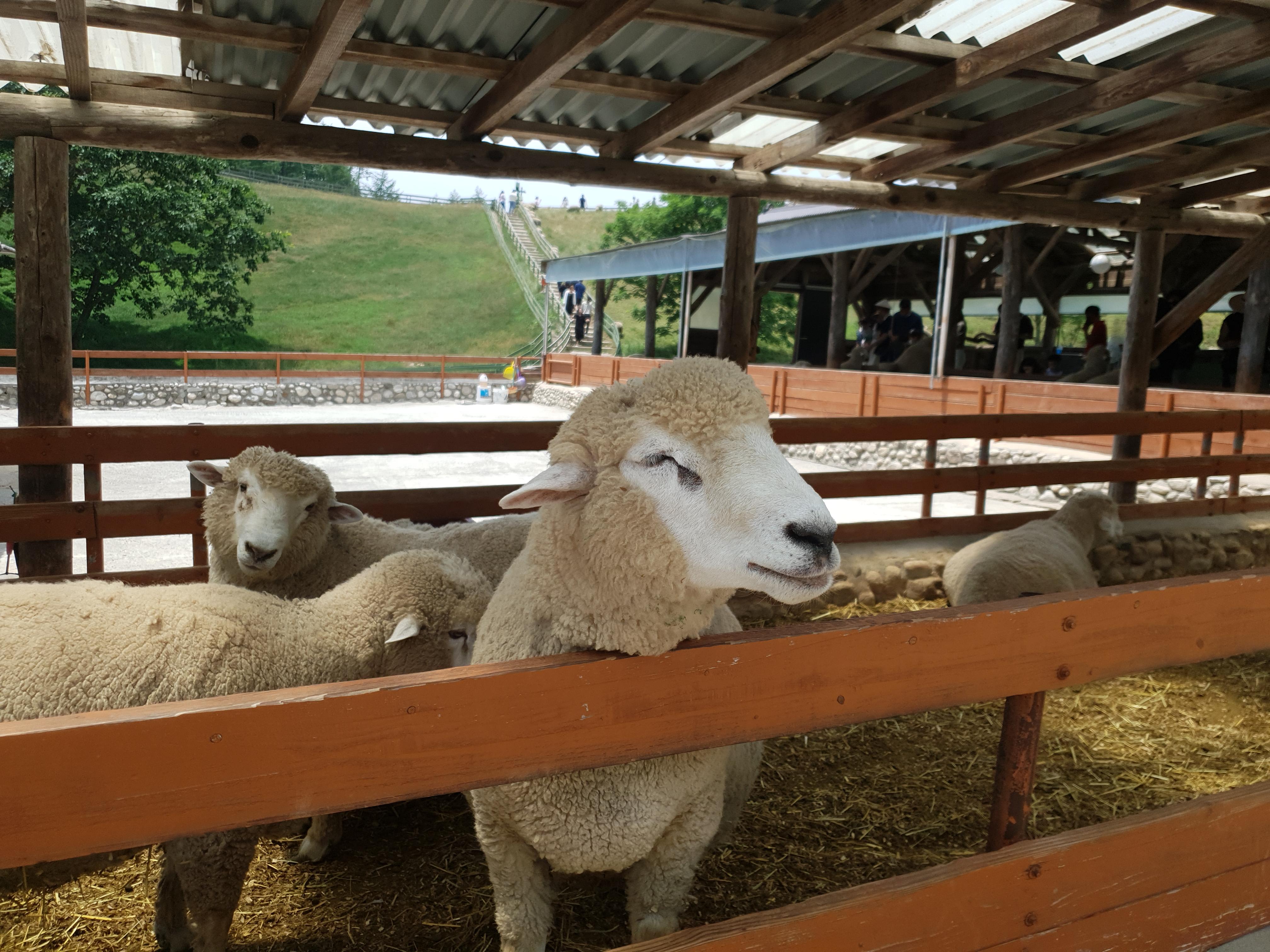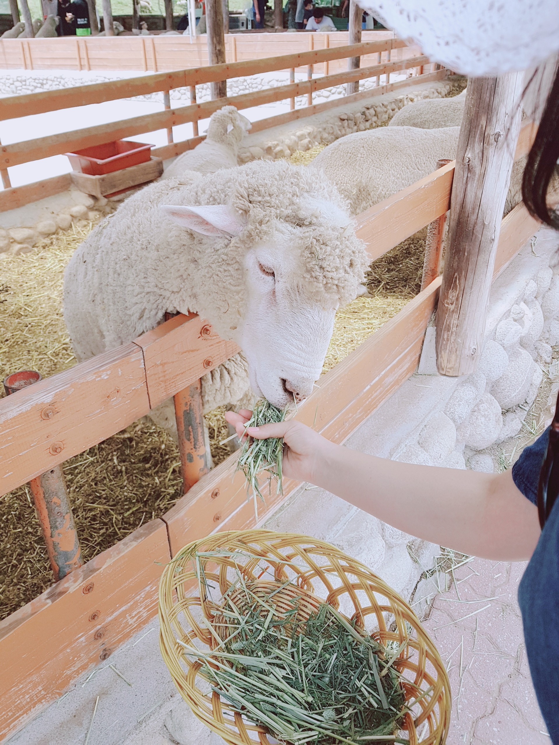 실내에서도 먹이를 줄 수 있지만, 남자친구가 소외받은 양들에게 목초를 주자고 해서 저희는 실외로 이동했어요. 목초를 주는 방법을 설명해주셨는데, 목초를 손가락으로 집고 있으면 양들이 입술을 이용해서 먹이를 먹는다고 해요. 양들이 목초를 먹을 때 거칠지 않다고 하시지만 양들이 식탐이 있어서 너도나도 먹으려고 달려들더라고요. 그래서 저희는 바구니 채로 줬어요. 은근 힘이 세니 바구니를 꼭 잡고 있어야 될 것 같아요.