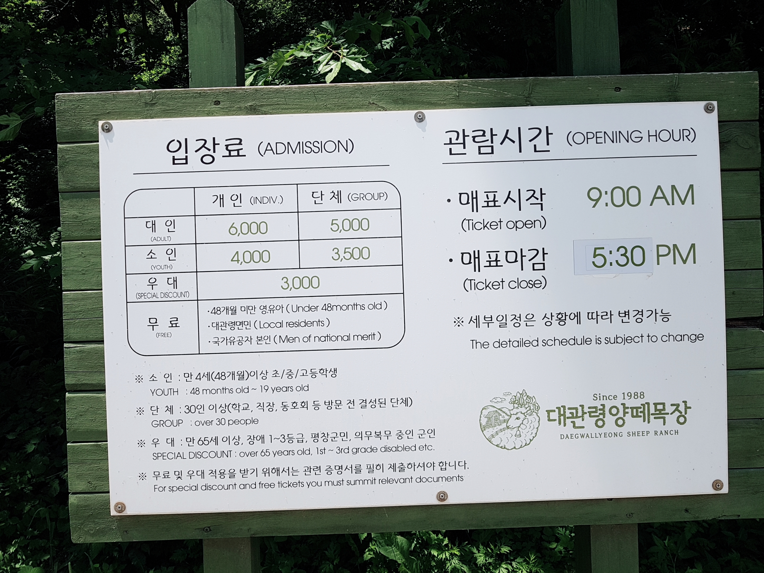 초입길에 적혀있는 입장료와 관람시간입니다. 입장료가 다른 목장에 비해 저렴하네요. (삼양목장은 9,000원, 하늘목장은 7,000원인데 이 곳은 6,000원입니다) 저희는 어른 두 명이라 12,000원을 지불했어요.