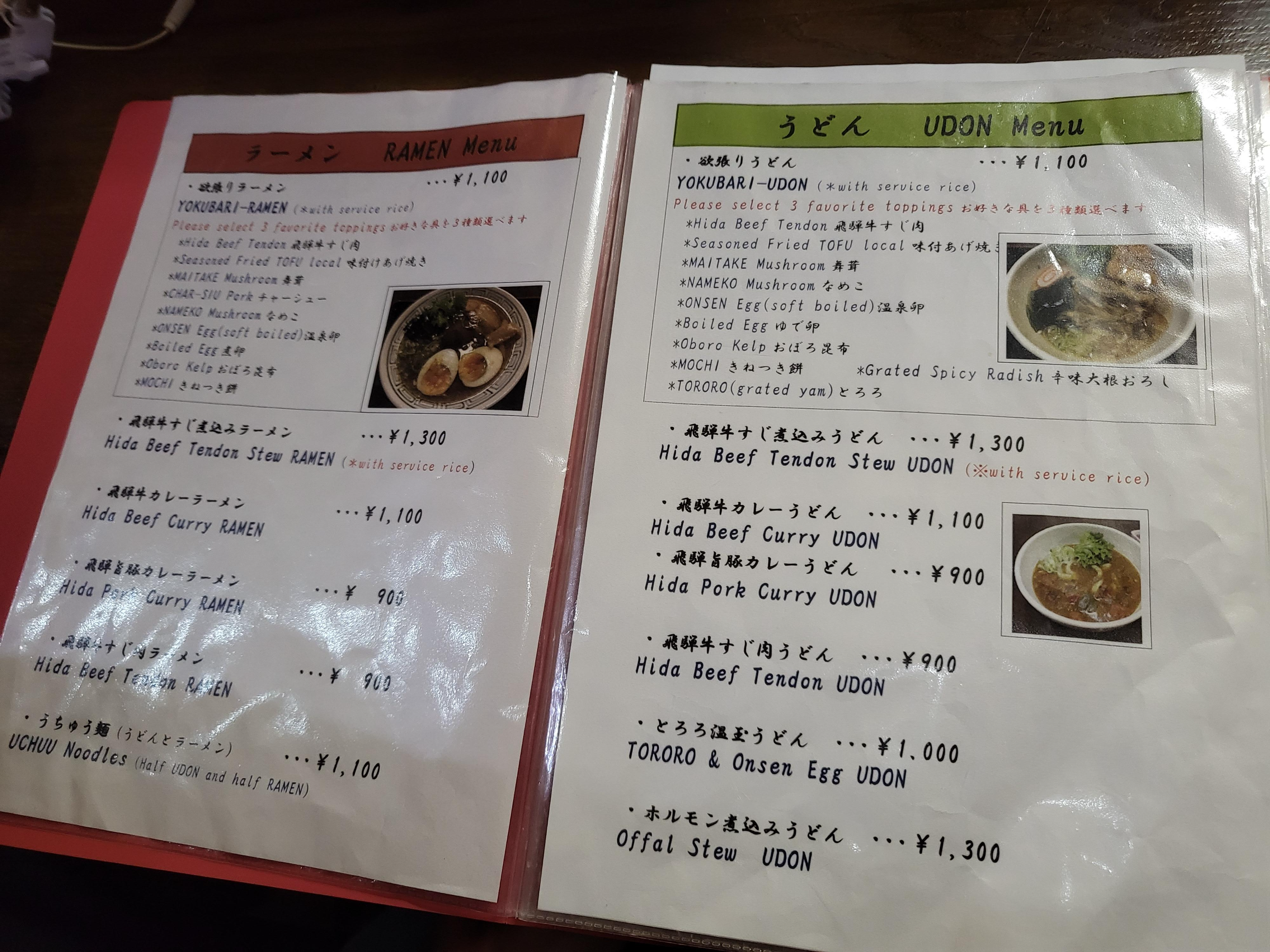 일단 제가 시킨 우동이 소개되어 있는 우동입니다. 제일 위에 있는 요쿠바리 우동을 주문했는데요. 리스트에 있는 토핑 중에 세 가지를 선택하면 됩니다. '요쿠바리'의 뜻이 욕심쟁이라는 의미인데 푸짐한 양을 표현할 때 쓰는 단어라고 해요. 요즘 엔저현상으로 가격대도 꽤나 준수하지요?