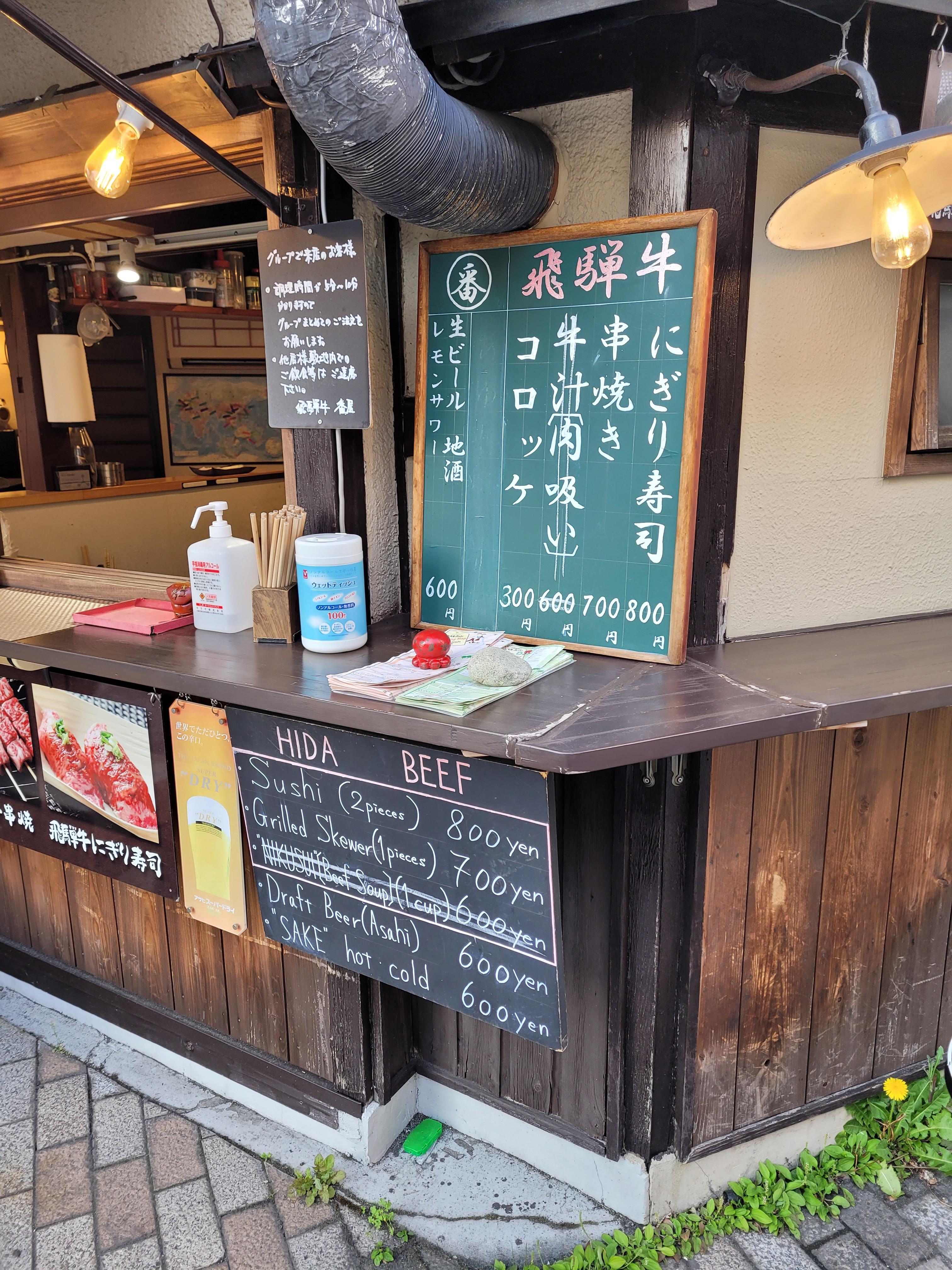 히다규를 구워주실 때까지 잠시 기다렸고요. 밖에서는 앉아서 먹을 곳은 없고 스탠딩 좌석만 있었습니다. 간판에 일본어로 니기리 스시라고 적혀있지만 구글맵에 그렇게 검색을 안나오는 수상한 곳이에요ㅎㅎㅎ