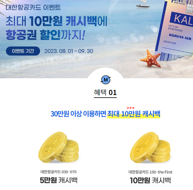 하지만 대한항공 홈페이지-이벤트 카테고리에 들어가시면 연회비 캐시백의 혜택을 받을 수 있습니다. 대한항공카드150의 경우 10만원 캐시백이기 때문에 연회비 5만원인 셈이고 그 마저도 10만원 캐시백이 들어온 후 해지하면 지불한 5만원의 연회비도 어느 정도 환급 받을 수 있습니다. 발급 후 3개월 지난 시점에 본인 계좌로 지급한다고 하니 최소 3개월은 유지해야 합니다. 만약 대한항공 항공권을 발급할 계획이 있으면 카드를 유지하겠지만 만 0세 아이를 키우는 입장에서... 당장 해외 여행 계획은 없어서 해지를 고려하고 있긴 합니다. 다만 내년에 해외 여행을 해외 호텔, 항공권 구입 시에는 마일리지 추가 적립이 되니 이 점은 장점이라 유지도 고민 중입니다. 여행을 자주 가시는 분들은 대한항공카드가 충분히 메리트 있어 보입니다.