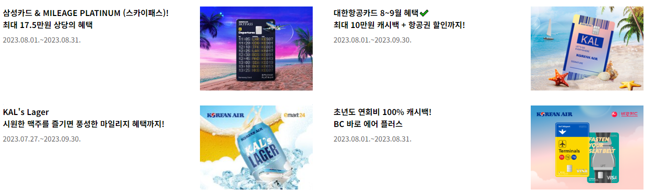 올 해 초까지만 하더라도 마일리지카드 신규 발급만 해도 마일리지 추가 증정을 해주는 카드사가 많았어요. 하지만 대한항공 마일리지 개악이 취소되자 마일리지 추가 증정 이벤트가 싹 사라졌더라고요. 대신 현금 혜택을 주는 카드가 있긴 하지만 마일리지는 현금으로 구입하기가 힘들기에 저는 마일리지 추가 증정을 해주는 카드를 선호했죠.