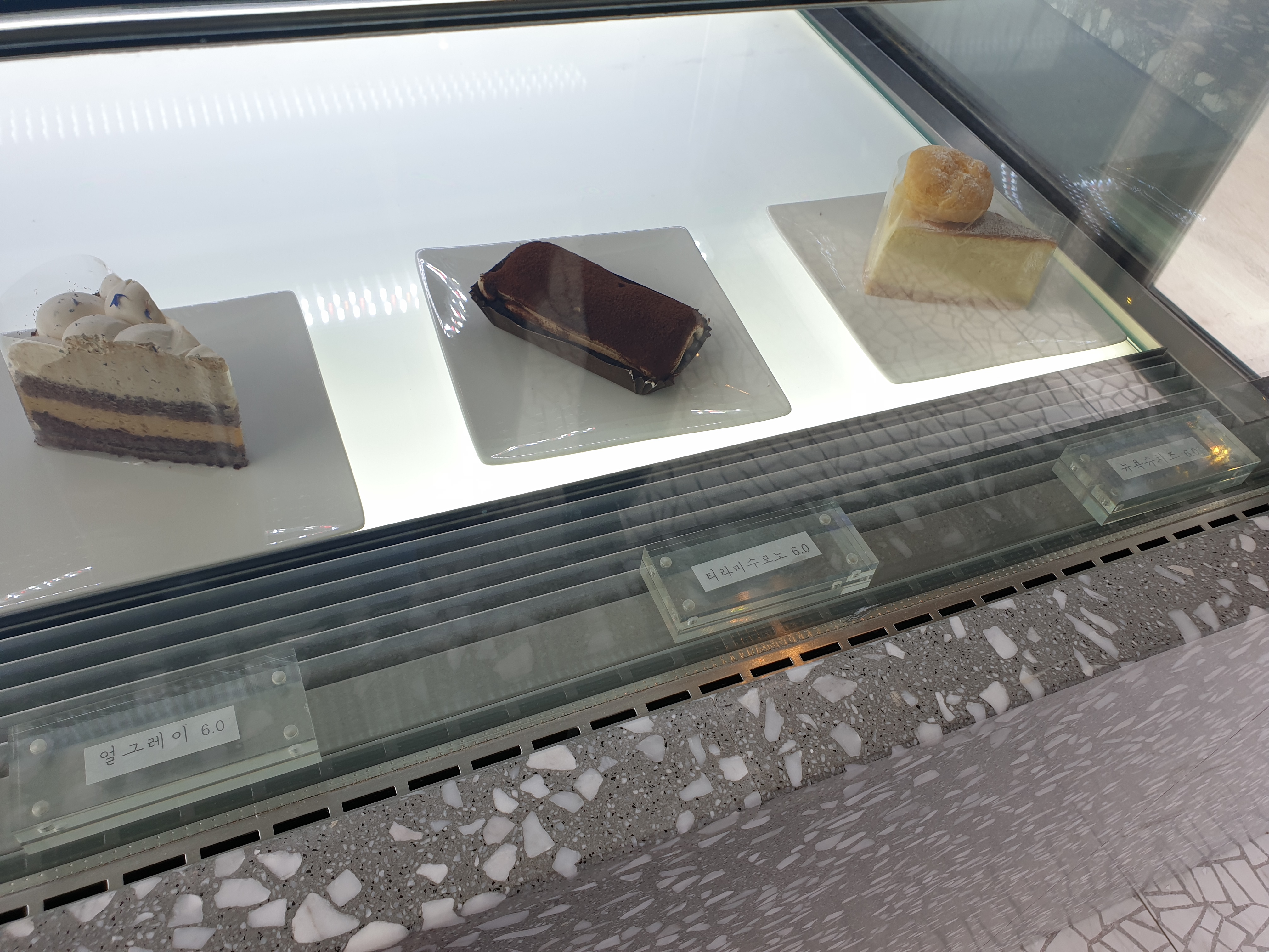 커피와 같이 먹으면 좋을 얼그레이(6,0), 티라미수모노(6,0), 뉴욕슈치즈(6,0) 케이크도 진열되어 있었는데요. 다만 사람들이 거의 주문하지 않겠지요ㅎㅎ