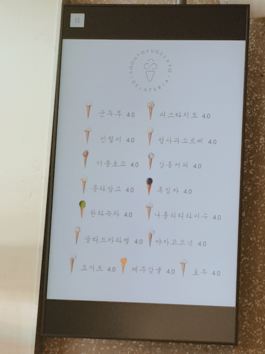 젤라또 메뉴판인데요. 순두부 맛 말고도 인절미, 더블초코, 플라망고, 한라녹차, 솔티드카라멜, 요거트, 제주감귤, 호두, 야자코코넛, 나폴리티라미수, 흑임자, 강릉커피, 피스타치오, 청사과소르베 맛이 있습니다. 모두 4,000원으로 동일해요. 저희는 순두부 젤라또 말고 다른 맛을 주문해보려고 했는데 2시가 살짝 넘은 시간이었는데도 best 메뉴는 거진 품절이더라구요...ㅠ_ㅠ 특히 호두맛과 나폴리티라미수맛! 조금 아쉬웠어요.