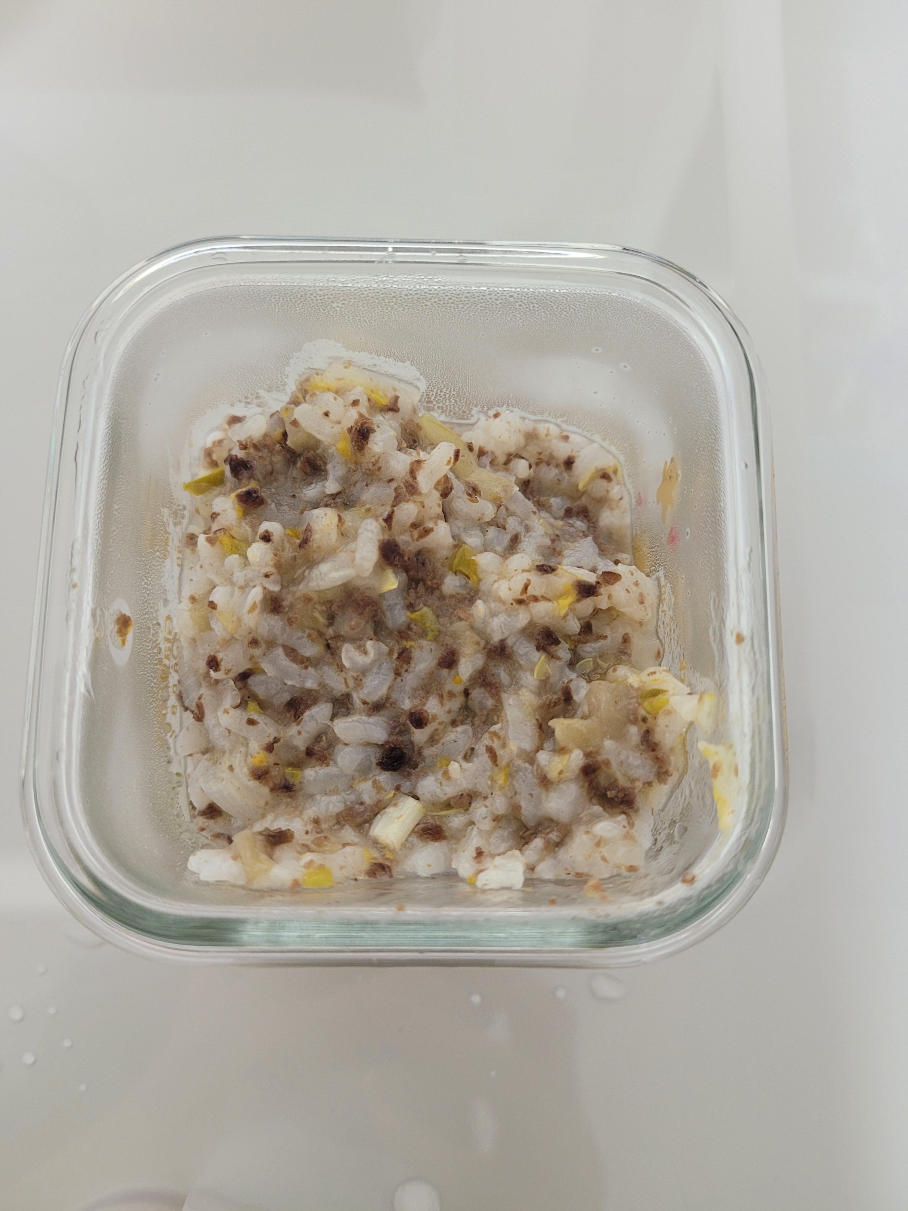 종합하자면, 한 칸에 불리기 전 쌀 60g+오트밀 10g+고기 또는 생선류 50g+ 야채 3종 75~85g+육수 250g입니다. 만들다 보면 정확하게 계량이 안될 때가 있는데 이제는 정확히 넣으려 애쓰지 않고 유연하게 하려고 해요.