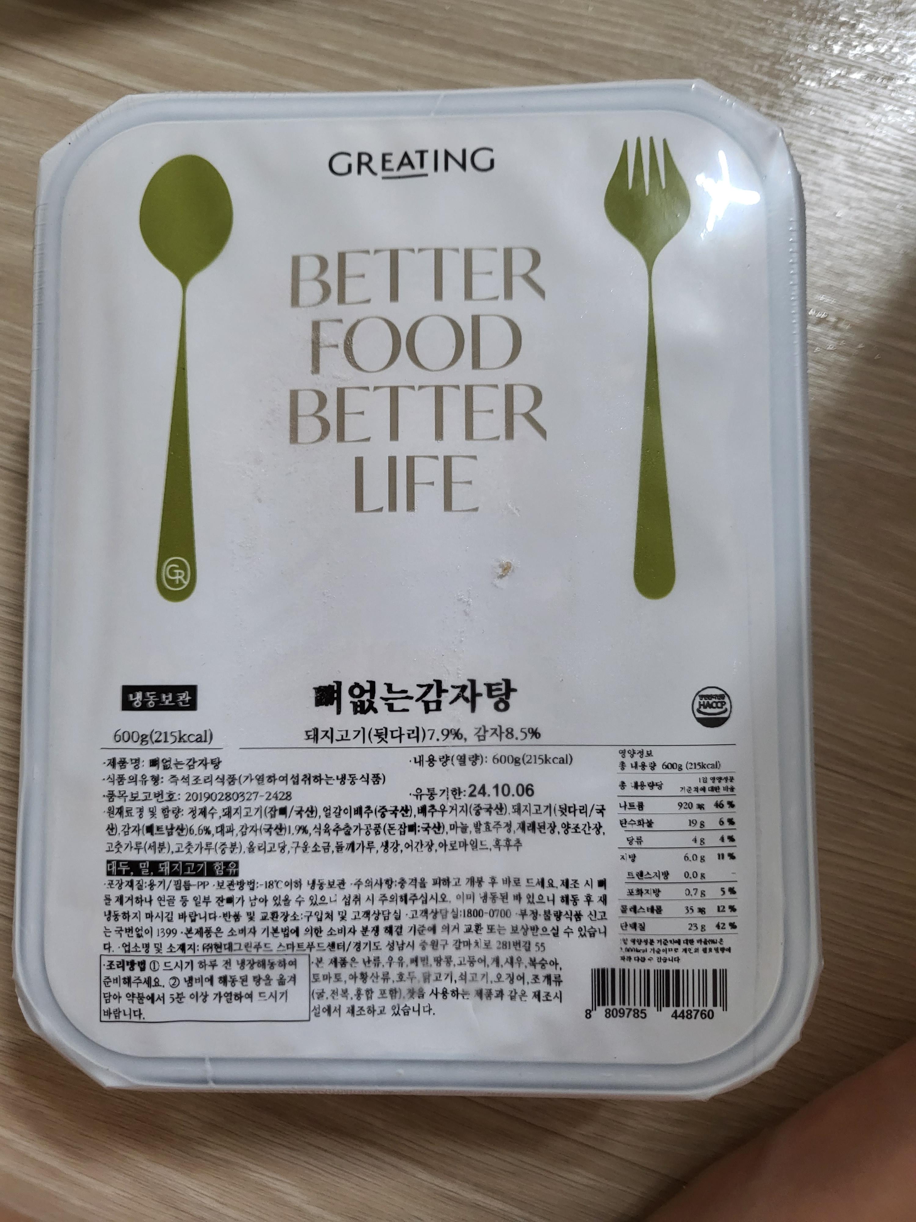 마지막 아이템은 뼈없는 감자탕으로 비추템입니다. 함량을 보시면 돼지고기가 7.9%, 감자 8.5%로 고기가 굉장히 조금 들어가있어요. 원재료를 보더라도 식육추출가공품? 이라는 요상한 재료가 들어가 있답니다. 집에서도 감자탕을 먹을 수 있다니 기대했는데 맛도 그닥이었고요. 그래서 그런지 사진도 찍지 않았네요. 시키면 돈 아까운 메뉴로 그리팅 베스트 메뉴나, 추천메뉴 위주로 먹는게 좋다고 느꼈습니다.