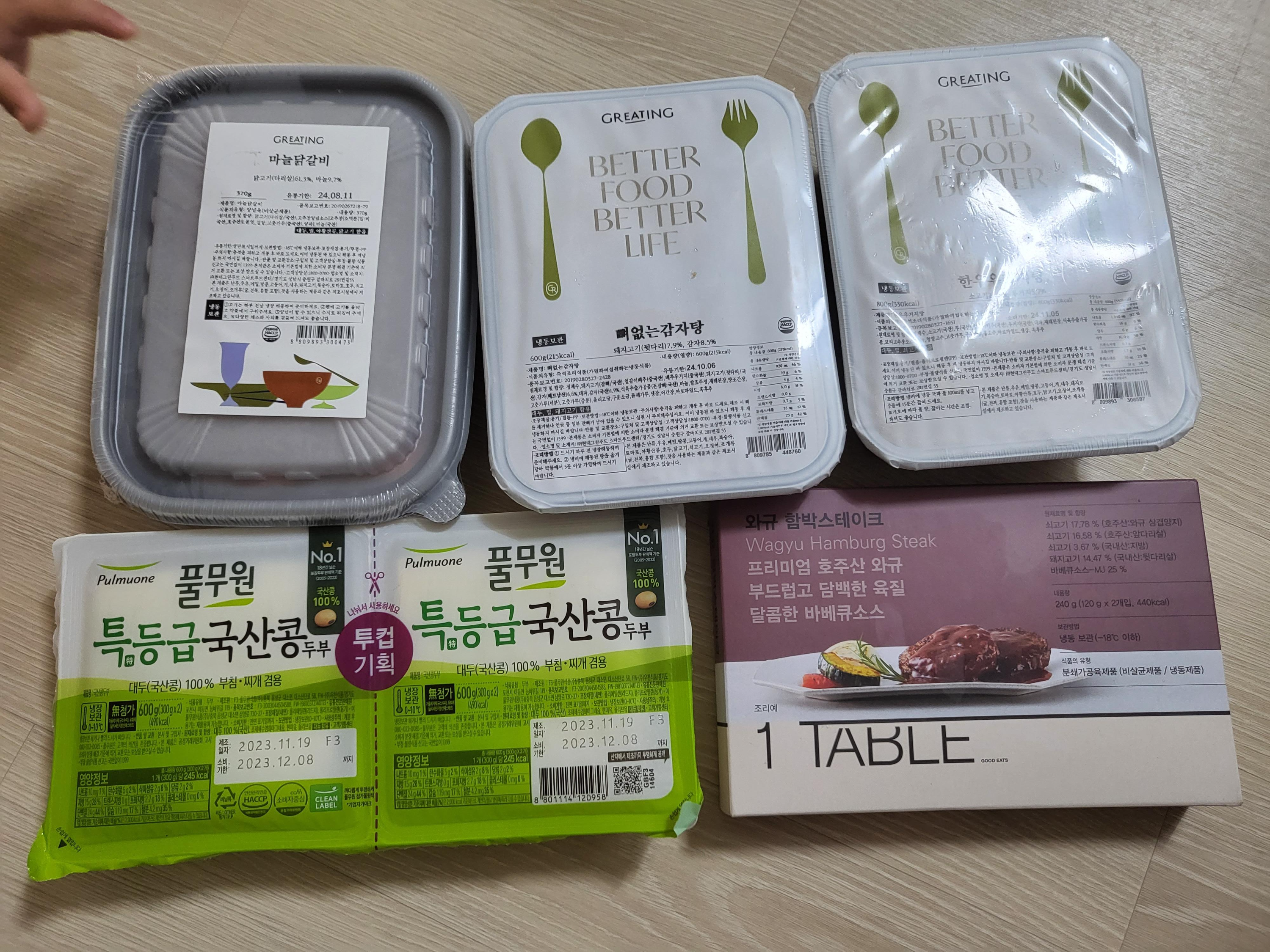 제가 이번에 주문한 내역은 마늘닭갈비, 뼈없는감자탕, 한우우거지탕, 와규 함박스테이크, 풀무원 특등급 국산콩 두부 2입이에요. 총 결제금액은 22,610원으로 거의 반값 정도 저렴하게 구입했어요. 다만 그리팅의 단점은 당일 배송이 아니라는 점이에요. 택배로 배송되기 때문에 뭐랄까 마켓컬리, 이마트랑은 다르다고 느꼈어요. 모두 먹어보았는데 추천템도 있고 비추템도 있어요.맛있는 순서대로 포스팅해보겠습니다.