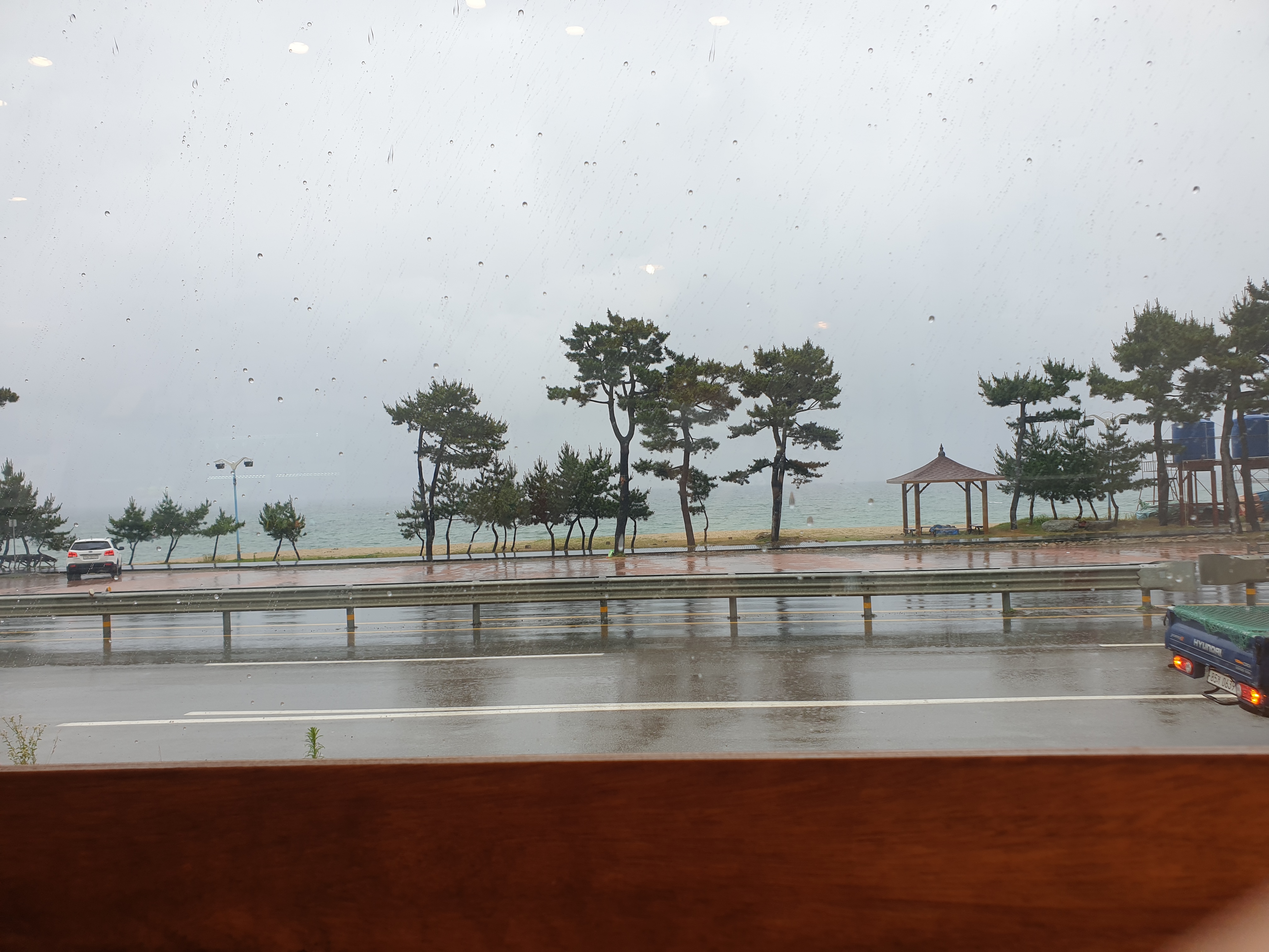 고요하게 비 내리는 경치 아래, 이번 여행 사진을 정리하며 여행을 마무리했던 카페 어느 멋진 날이었습니다.