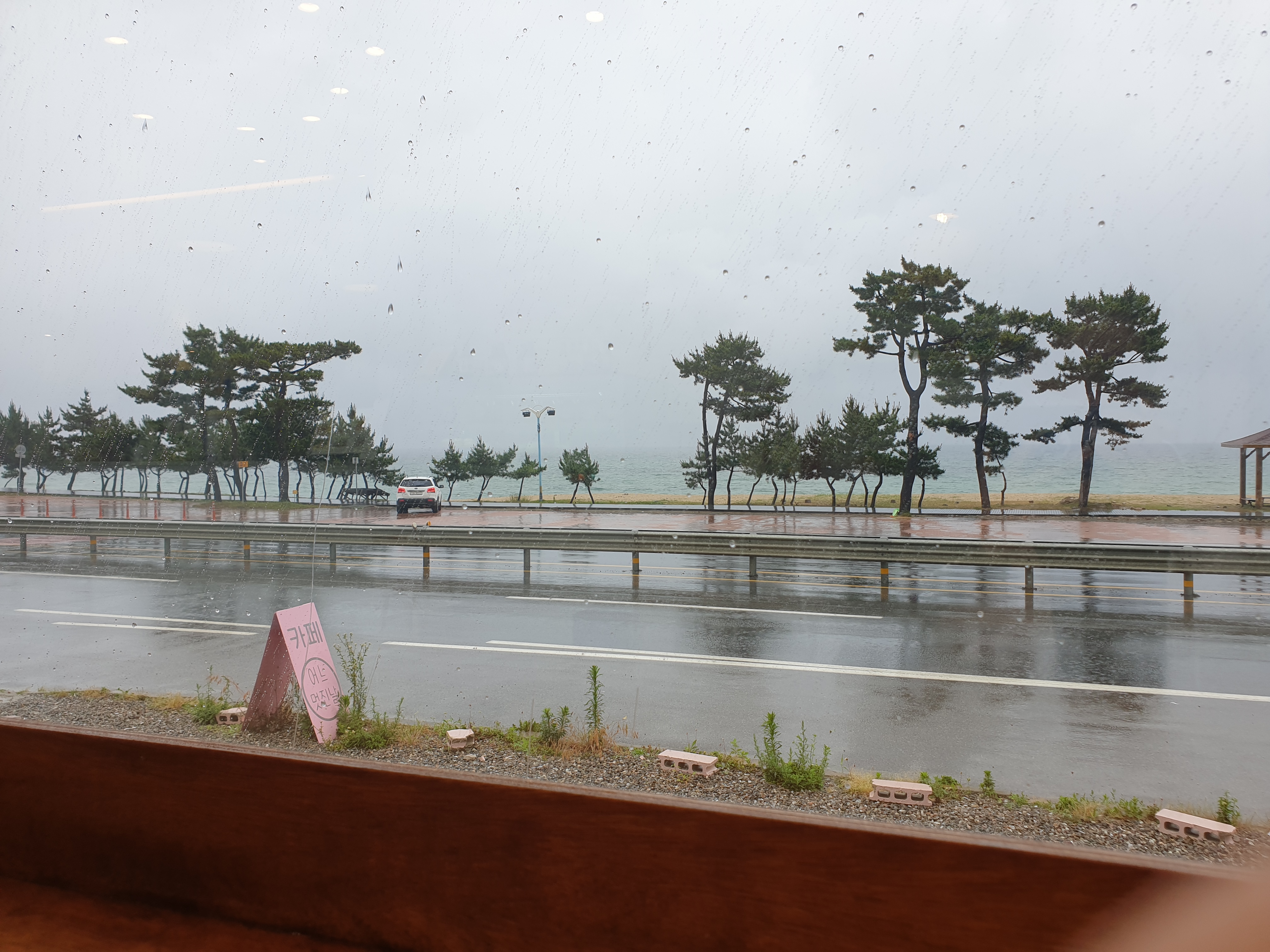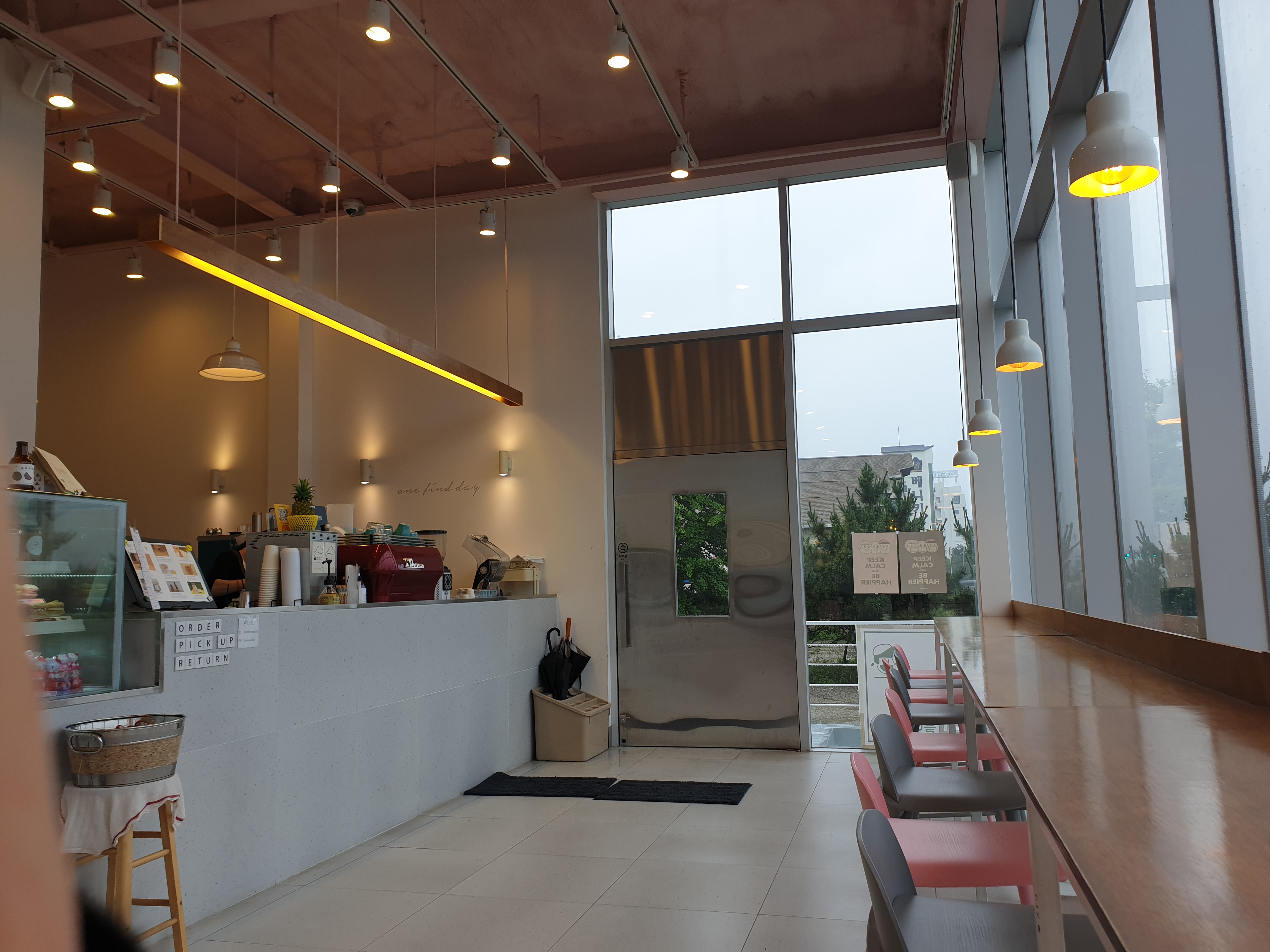 매장 내부에는 남,여 화장실 분리된 화장실이 있고, 청결해요. 매장 내부 자체가 인테리어도 예쁘도 층고가 높아요. 층고가 높으니 답답한 느낌이 들지 않아요. 물론 매장 한 면이 바다 뷰를 볼 수 있는 유리로 되어 있는 것도 한 몫하겠죠?ㅎㅎ단층으로 되어 있지만 날이 좋으면 루프탑도 열린다고 하네요. 비가 많이 와서 저희는 올라가 볼 겨를이 없었어요.