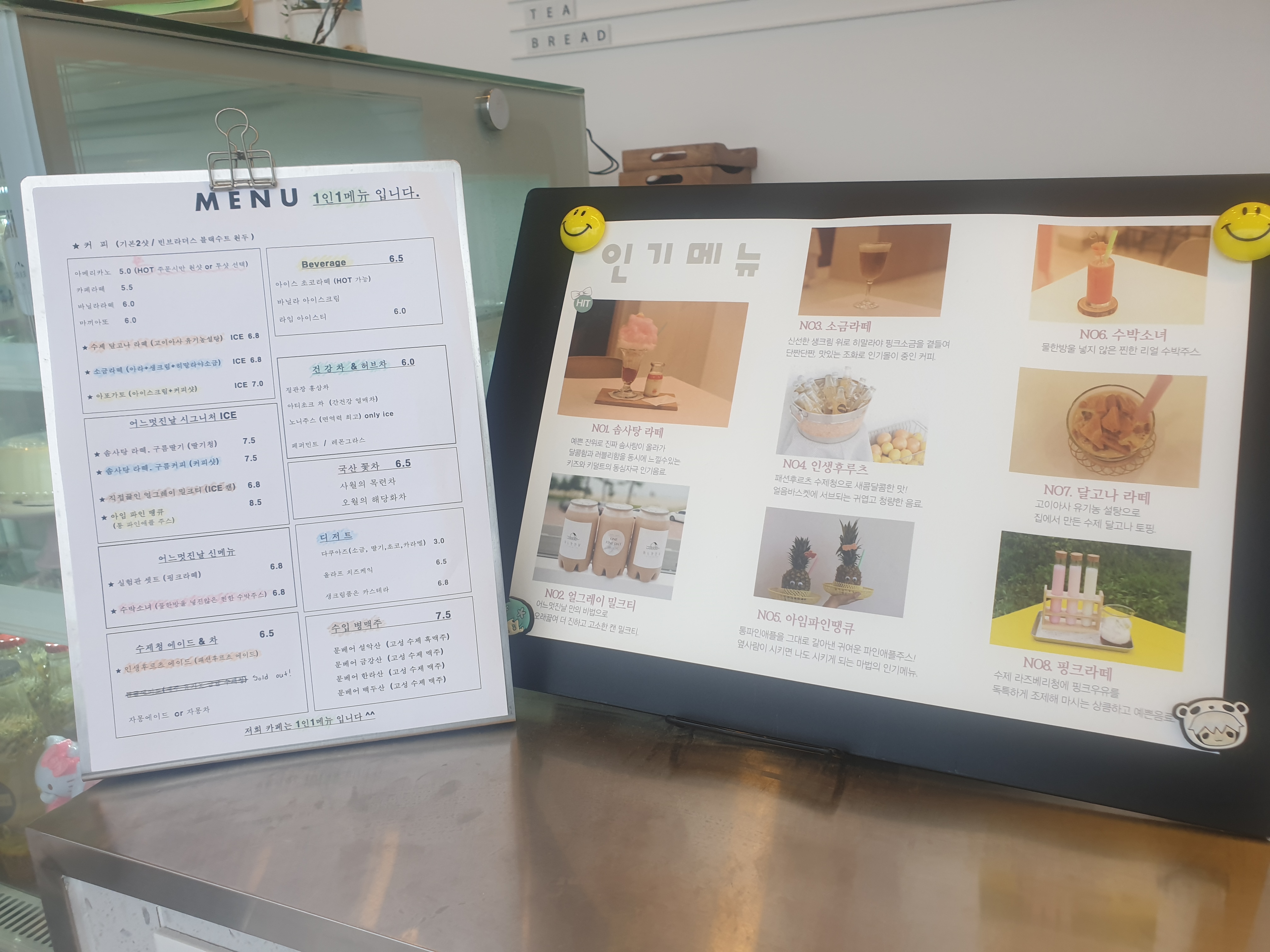 일단 메뉴판인데요. 인기메뉴로는 솜사탕 라떼, 소금라떼, 얼그레이 밀크티, 아임파인땡큐, 핑크라떼 등이 있더라구요. 하지만 저는 아아 덕후이기 때문에 아이스 아메리카노(5.0), 남자친구는 바닐라 라떼(6,0)를 주문했어요. 남자친구는 커피를 잘 마시지 않는 편이지만 이 날은 서울까지 운전을 해야 하기 때문에ㅠ_ㅠ... 참 고생했어요.