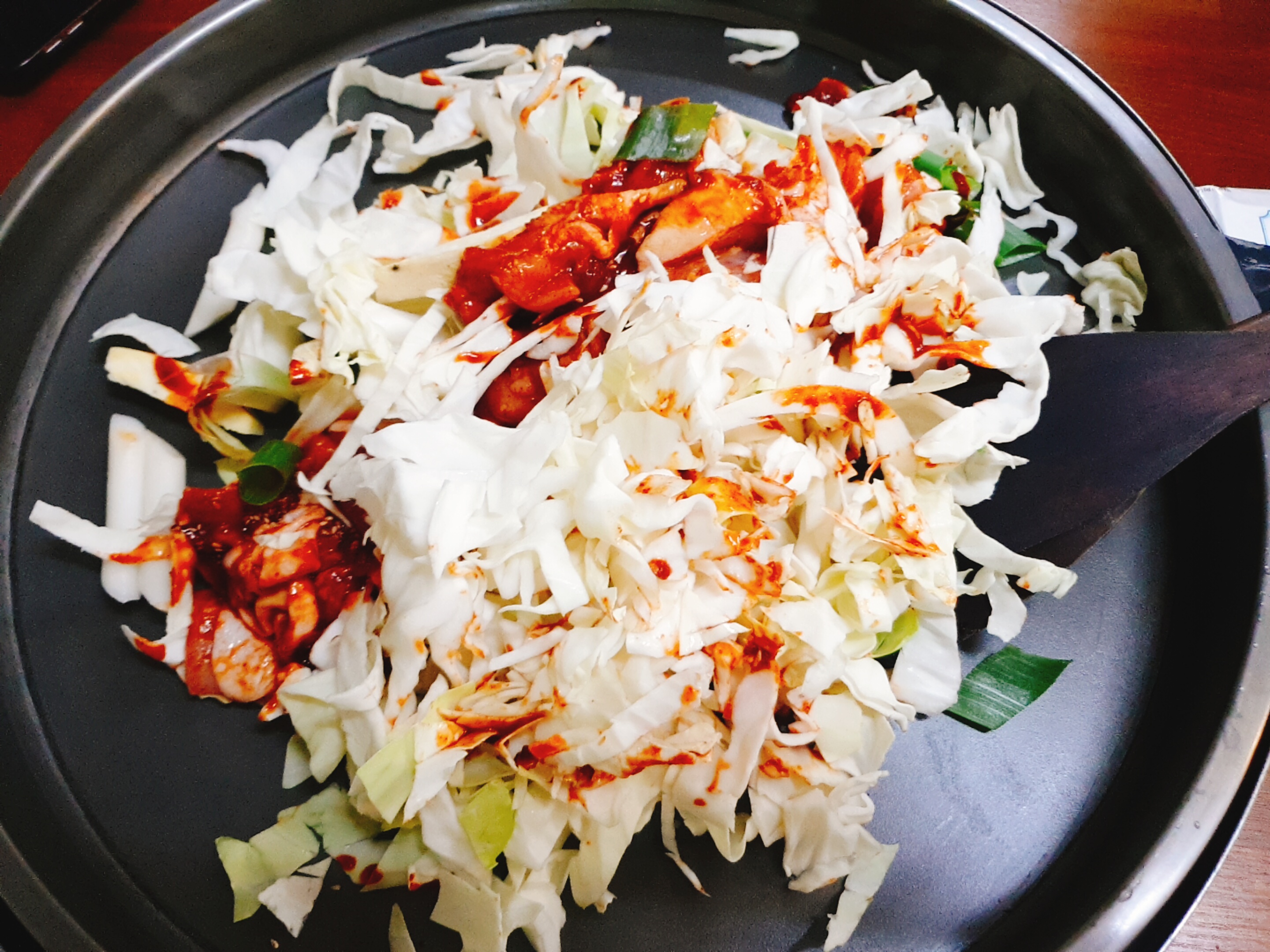 닭갈비 2인분이 나왔어요. 양배추가 좀 많은데 숨이 죽으면 적당합니다.
