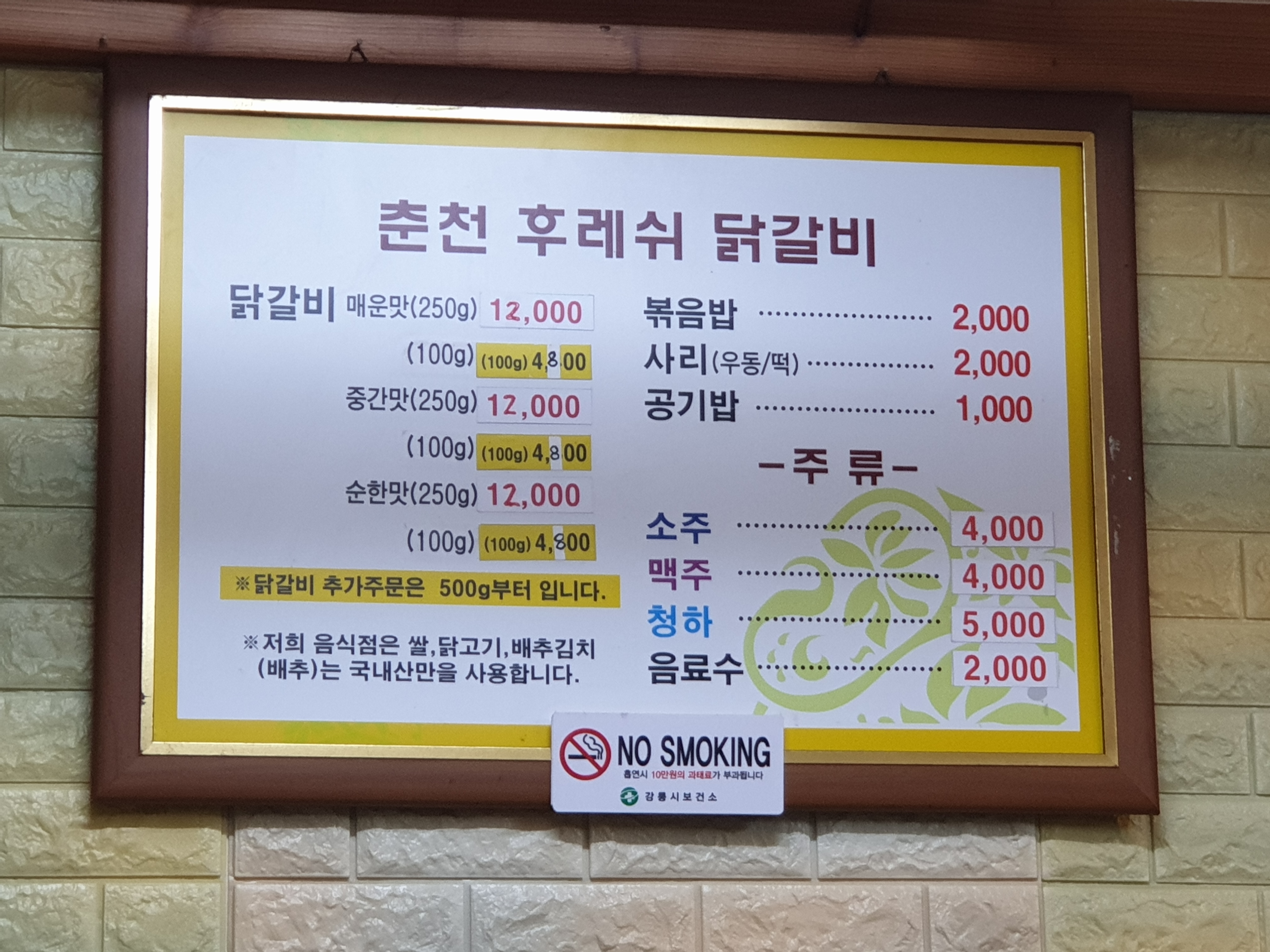 후레쉬 닭갈비 메뉴판인데요. 닭갈비는 매움 정도에 따라 세 가지로 구분되어 있네요. 저희는 닭갈비 중간맛으로 2인분(12,0*2)+ 우동 사리(2,0)를 주문했어요. 다른 닭갈비집에서는 라면 사리도 많이 팔지만 여기는 우동/떡사리만 판매하네요.