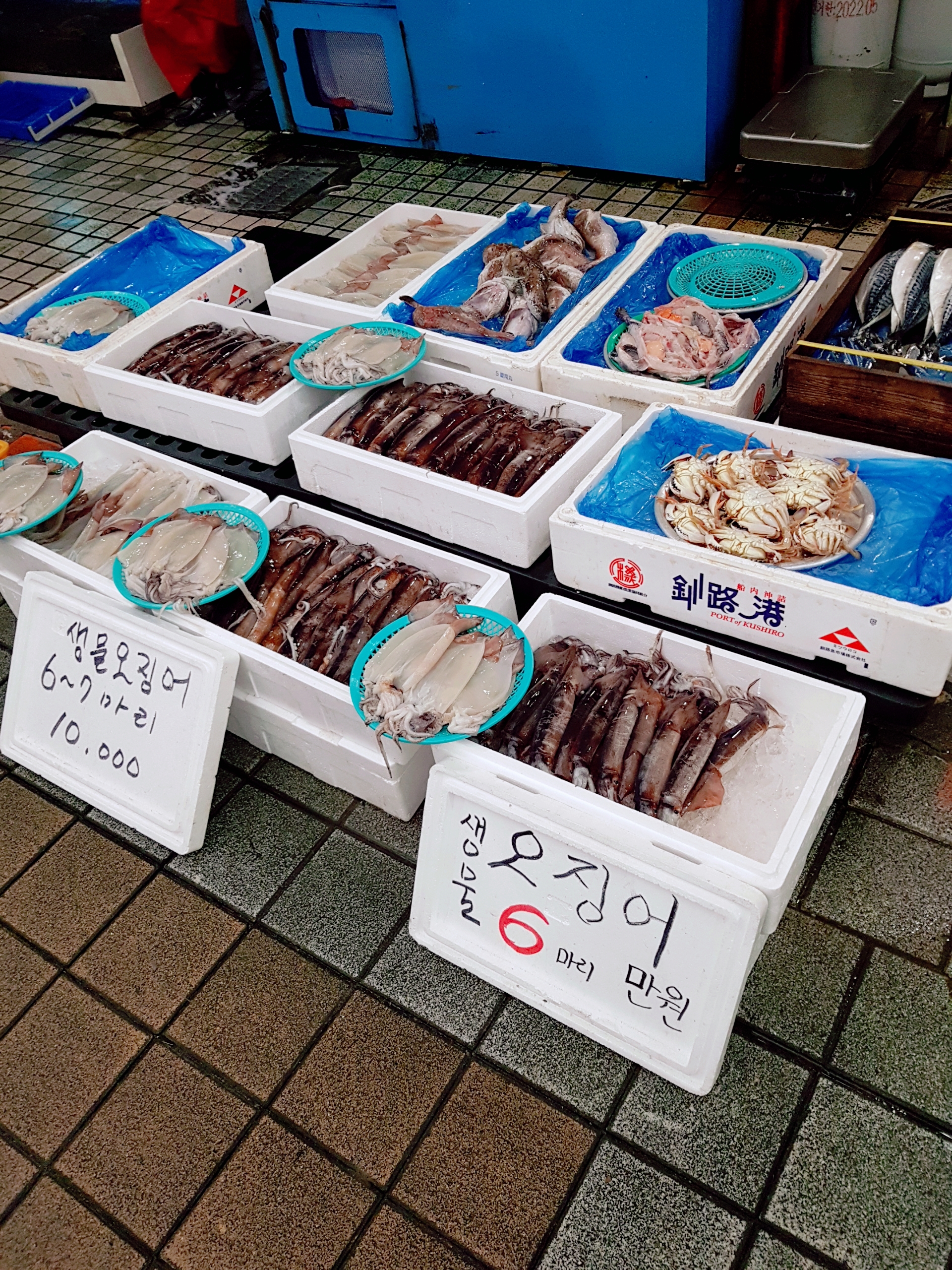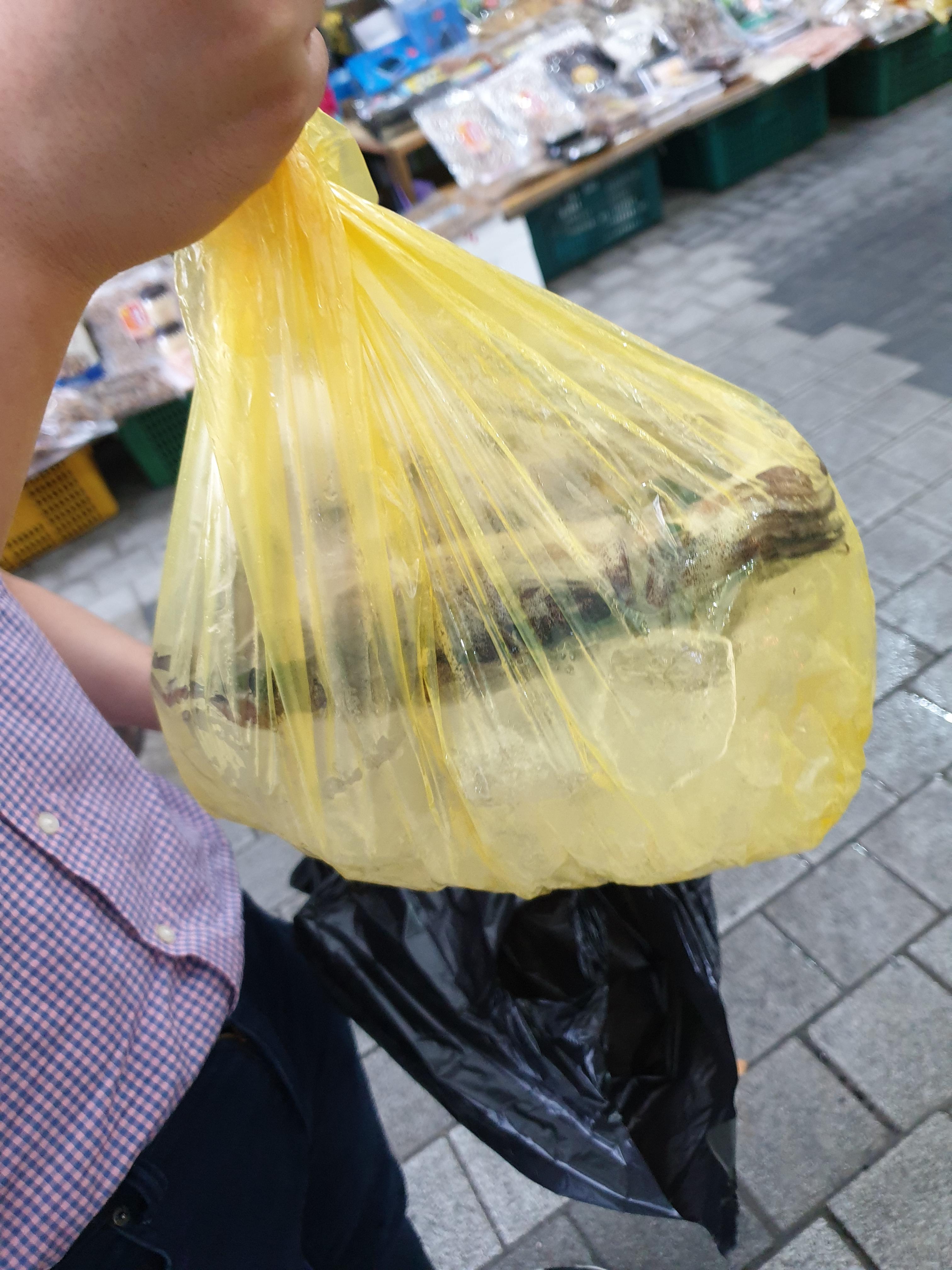 시장을 돌아다니다가 뭘 살까 고민했는데, 저희가 구입한 것은 바로 오징어입니다! 해산물이나 야채들의 신선도를 선별하는 능력이 부족해 오징어 상태가 어떤지 모르겠더라고요. 허나, 수도권에서는 오징어가 4마리에 만원 하던 때라서 가격대가 합리적으로 느껴져서 사는 쪽으로 마음이 기울었습니다. 가장 문제는 저 오징어 크기가 수도권에서 파는 오징어 크기와 같냐였죠. 그래도 현지 시장 인심을 믿기로 하고 구매하였습니다.