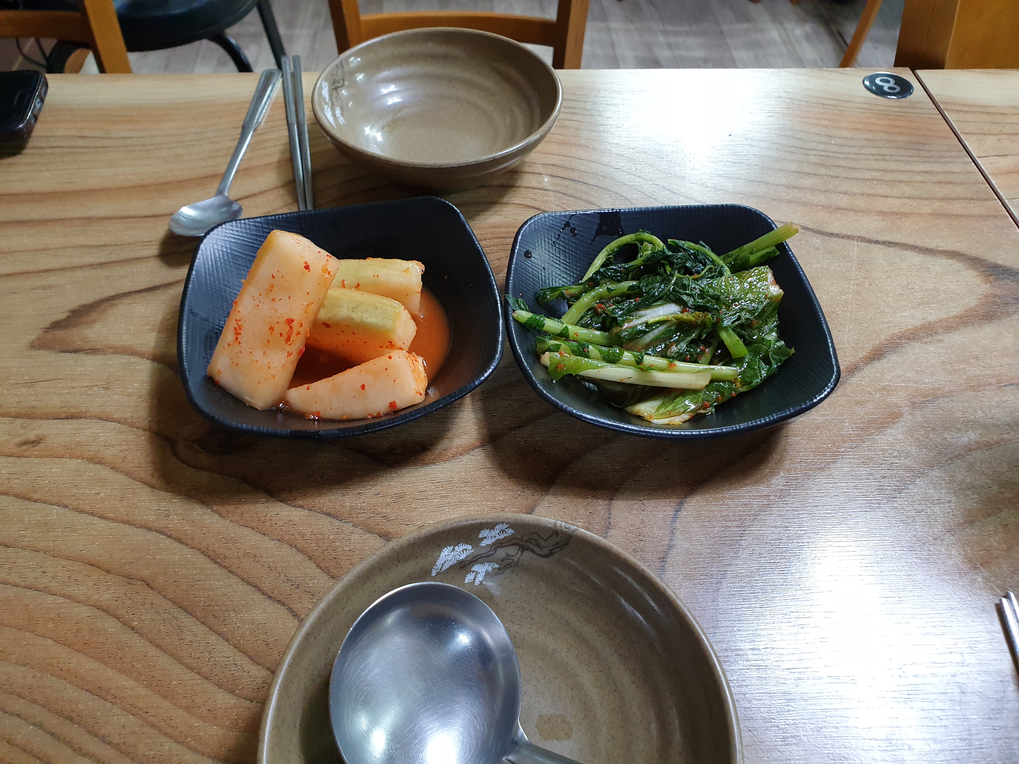 일단, 밑반찬이 먼저 나왔어요. 깍두기와 열무김치 둘 다 맛있었구요. 감자옹심이는 어떨까 기대하며 김치를 맛보았네요.