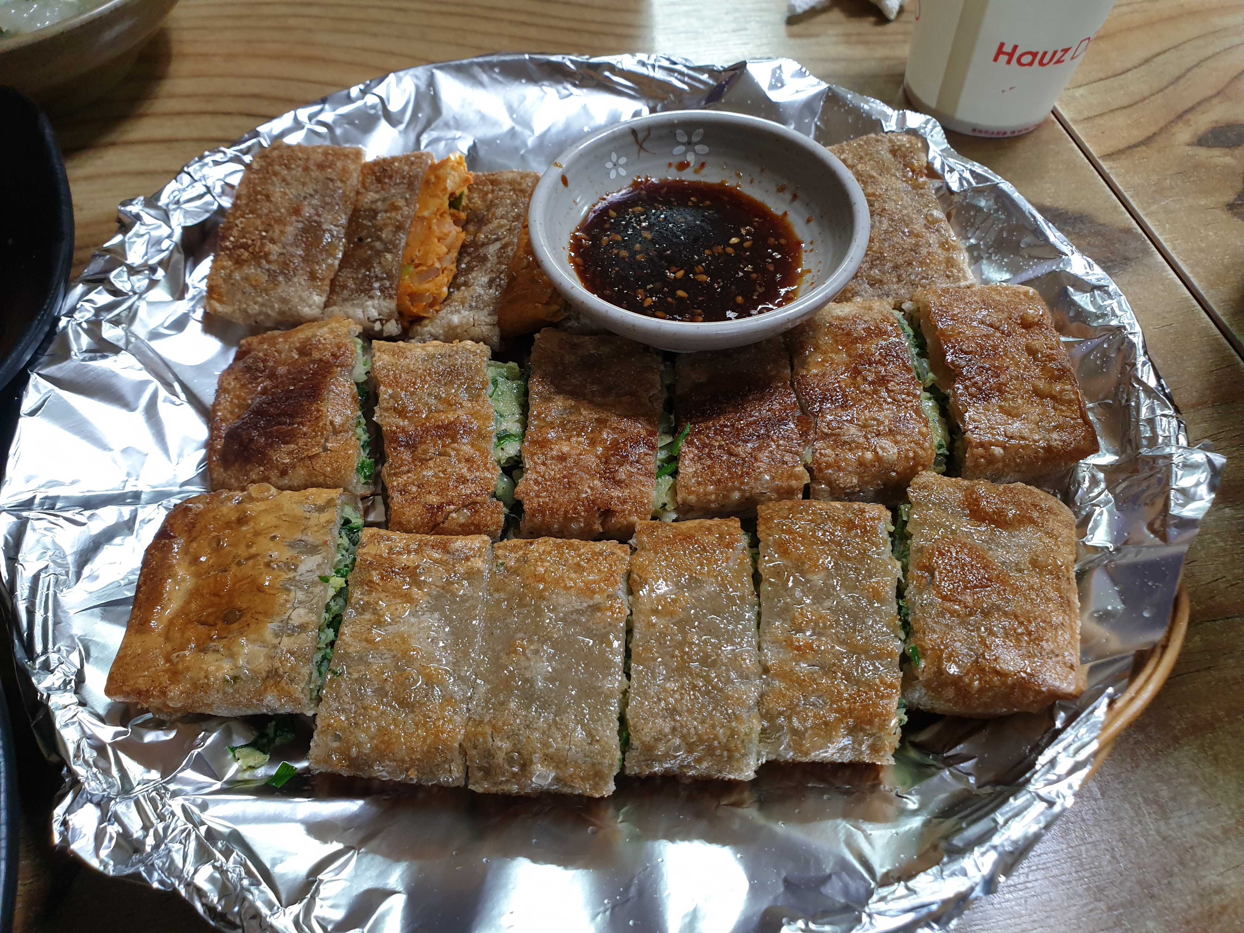 다음은 전병이에요. 맛은 김치전병과 곤드레 전병 두 가지가 나오는데요. 기름에 지진 부침개는 맛없을 수가 없으니 평균은 했지만, 미리 만들어 놓은 전병을 급하게 앞뒤로 살짝 구운 느낌이라 실망했어요. 차라리 오징어 부추전을 먹을걸 후회했네요. 만두 중에 코스트코에서 파는 메밀전병 만두를 좋아하는 데 그 맛이랑 조금 비슷헸어요. 다만 식당에서 갓 만들어 나온 강원도식 전병은 아니라는 거! 강원도식 메밀 전병은 그냥 양양 전통시장 안에 판매하니 그게 훨씬 맛있을 것 같아요.