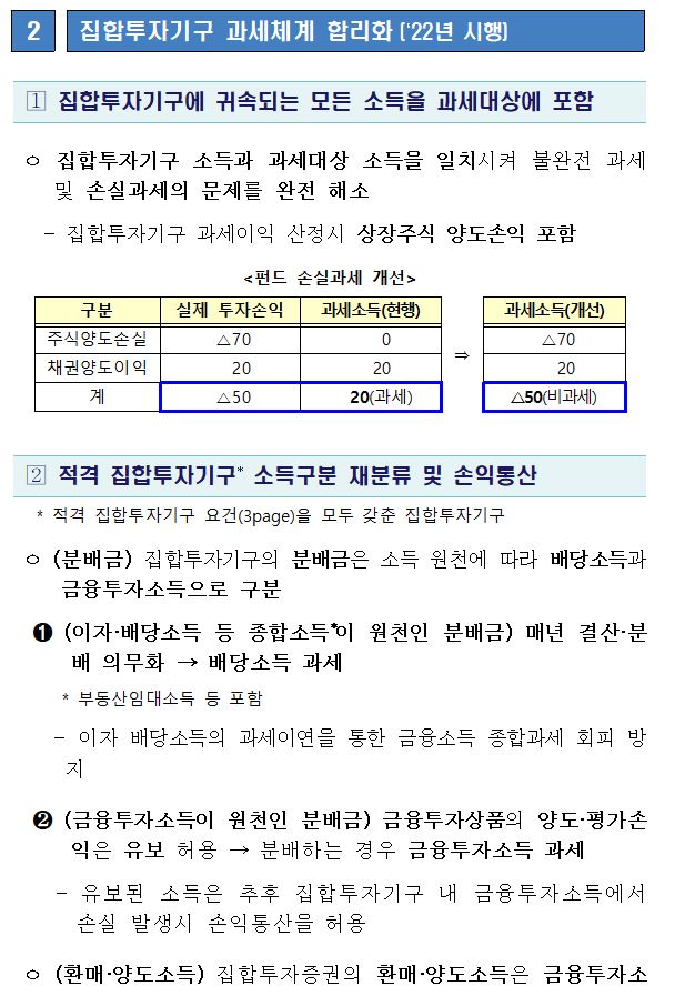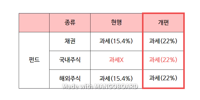 이번 세제개편안에서는 펀드에 귀속되는 모든 소득을 과세대상에 포함하며 펀드 손실과세 문제를 해소하였습니다. 즉, 국내주식 비중에도 세금을 부과하면서 위와 같은 상황을 타개해버린 것입니다.