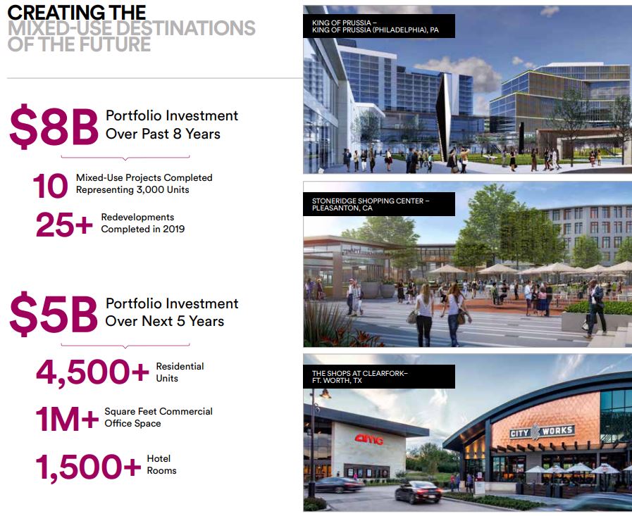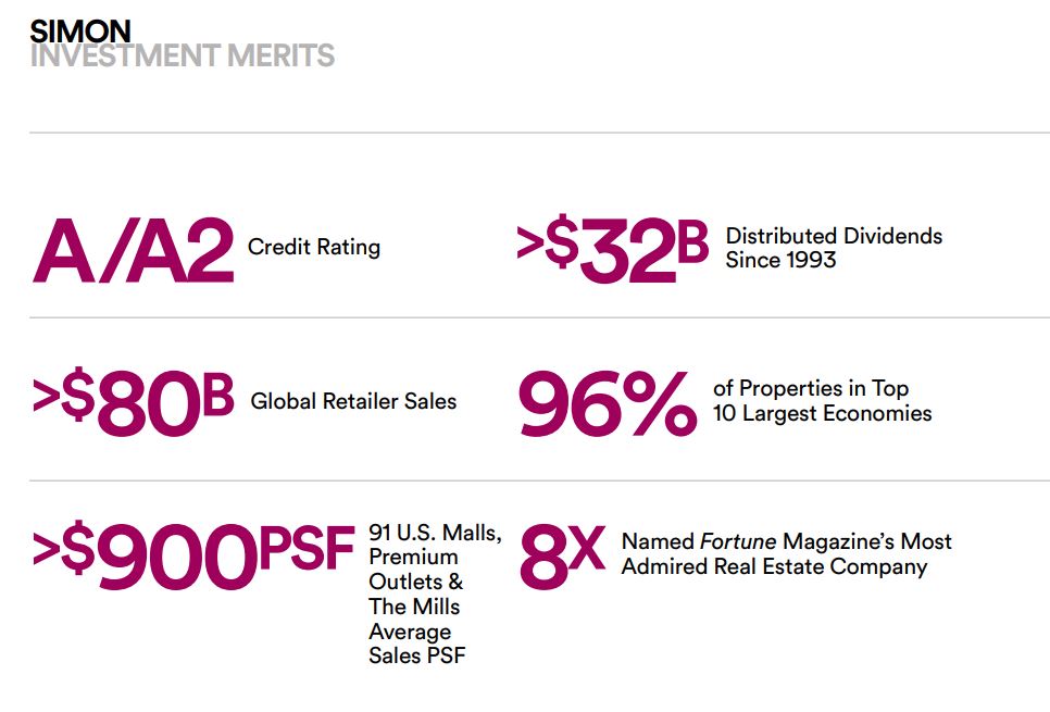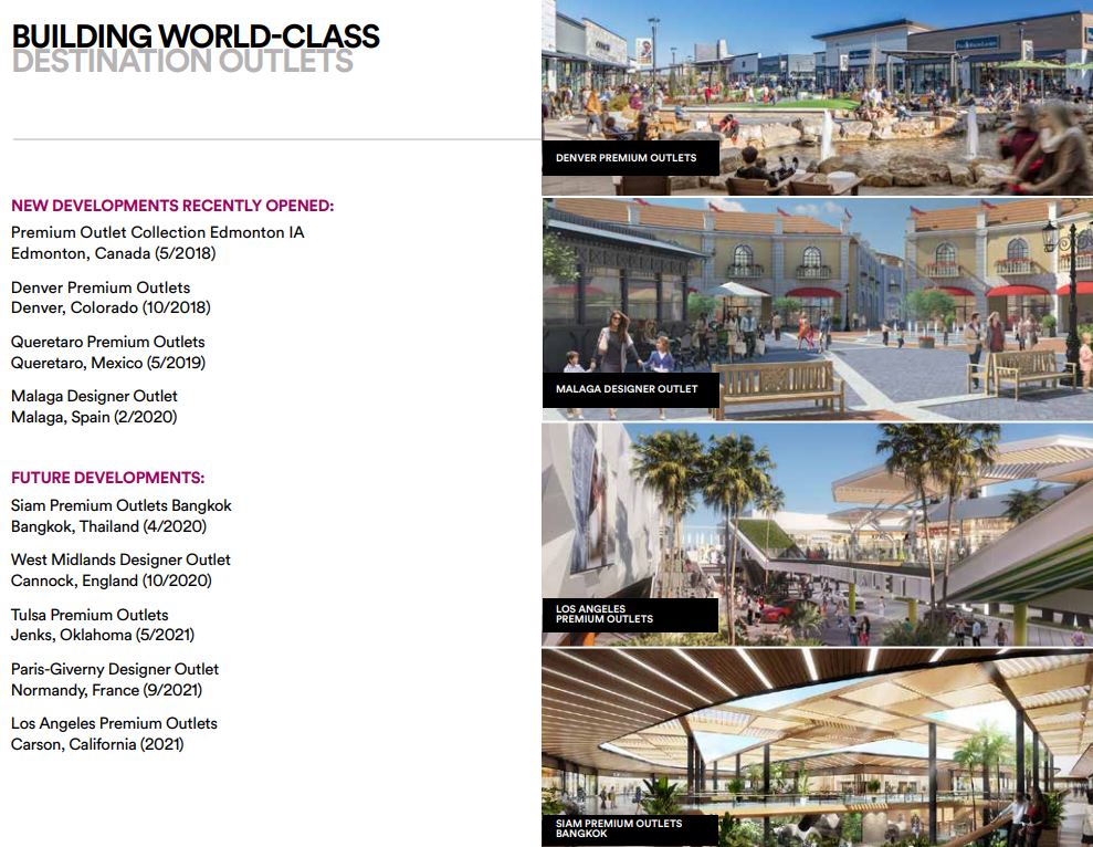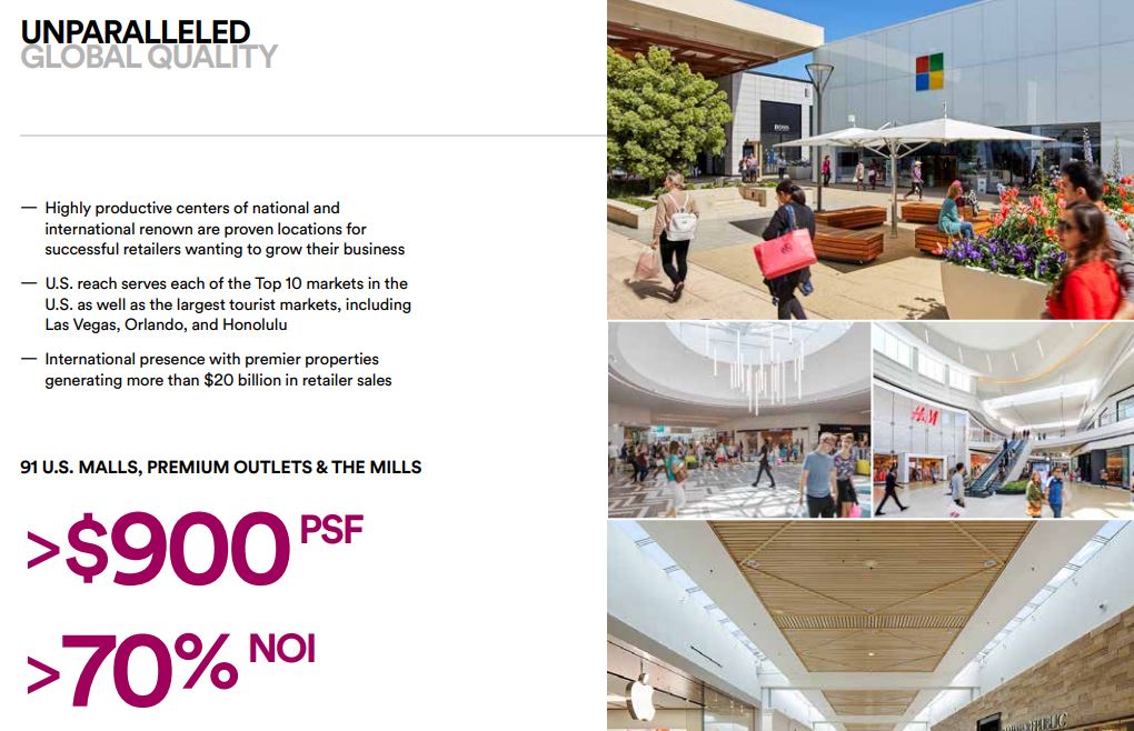 투자 매력 요소는 신용평가도- A/A2, 글로벌 상업(소매) 매출 - 800억 불 이상, 1993 이후로 배당금 지불액- 320억 불, 미국 쇼핑몰과 아울렛의 PSF-평균 900불 이상이라는 점이네요.