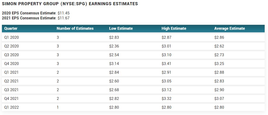 그래도 앞으로 2020년-2022년 추정 실적이 2불 중반에서 3불 초반까지 점점 증가할 가능성(표의 Average Estimate 참고)이 있으므로, SPG의 미래가 마냥 어둡다고는 볼 수는 없겠지요.