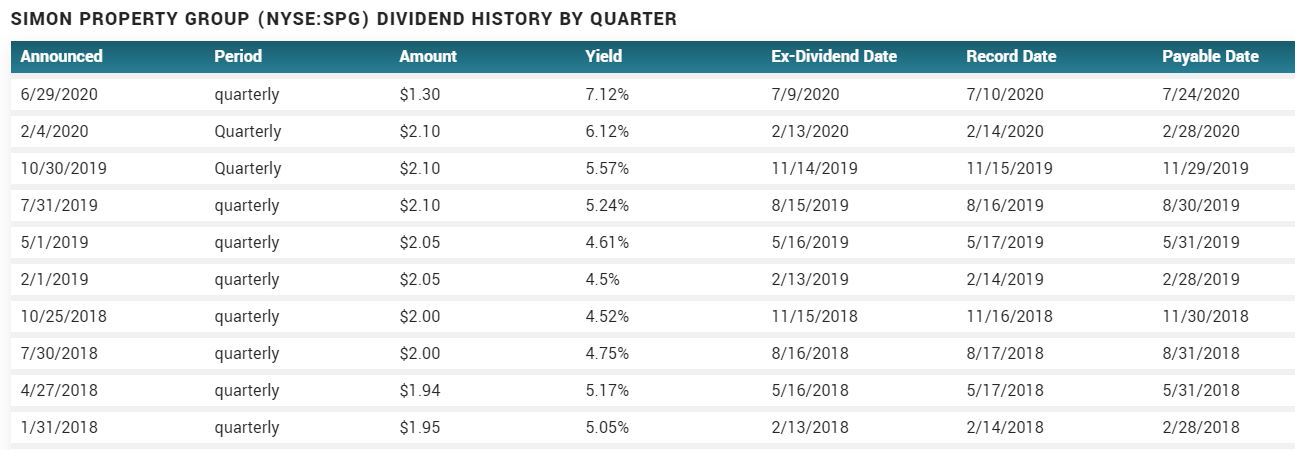 SPG 배당은 S&P500과 10년 채권 수익률에 비하여 지속적으로 증가하고 있지만, 위 그래프에서 간과한 것이 있습니다. 바로 2020년에 발생한 배당 컷입니다.