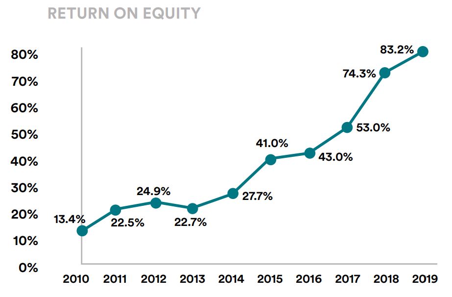 SPG의 ROE는 점차 증가하고 있어 2019에는 83%를 기록했습니다. 3년 평균 ROE가 연평균 15%에 달하면 기업이 효율적으로 영업활동을 하고 있다는 것을 의미합니다. 봐야 하는 다른 지표들도 있지만요. 그래도 회사의 자기 자본으로 얼마의 수익률을 올리는지 판단하는 지표이니 양호하다고 볼 수 있습니다. 2020년은 차트에서 확인 불가합니다.