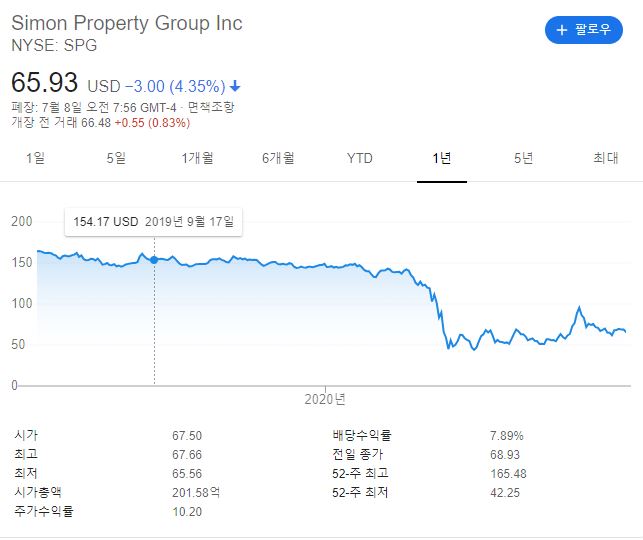 일단, 전체적인 차트는 위와 같습니다. 2020년 7월 8일 기준 약 66달러로 종가 마감하였네요. 코로나 19 전까지만 해도 SPG는 미국 주식 커뮤니티에 자주 거론되지는 않았는데요. 150달러 전후였던 주가가 코로나 이후로 42달러까지 곤두박질치면서 슬슬 입소문이 타기 시작했죠. 대표 리츠 배당주인 리얼리티 인컴(O)과 같이 배당수익률이 높고, 시세차익까지 덤으로 누리는 가능성 때문이었습니다.