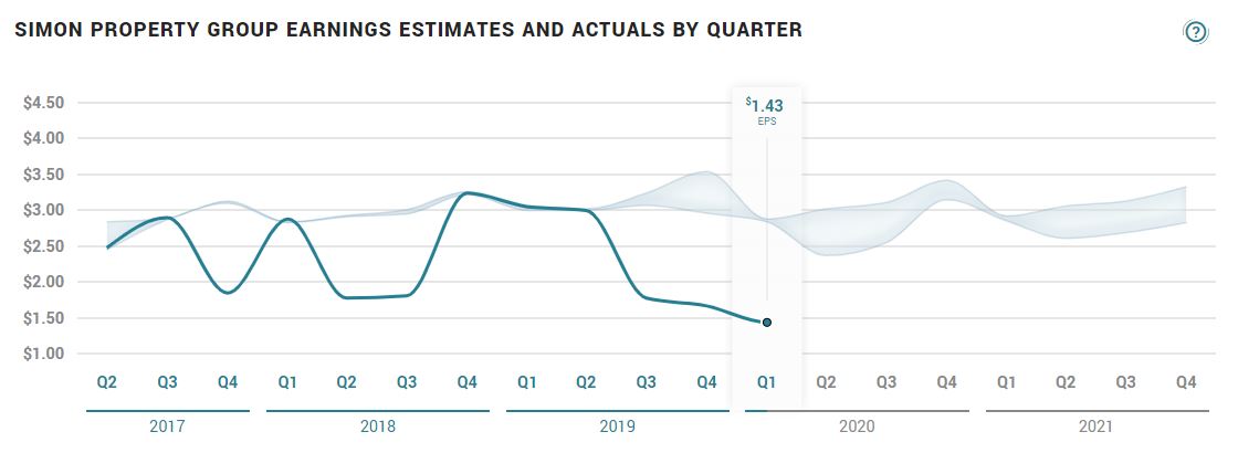 SPG의 EPS 차트입니다. 2017-2019년의 EPS에 비교했을 때 2020년 1분기는 1.43불이라는 역대 최저 EPS를 기록했습니다. (EPS가 높을수록 경영실적이 양호하다는 뜻)
