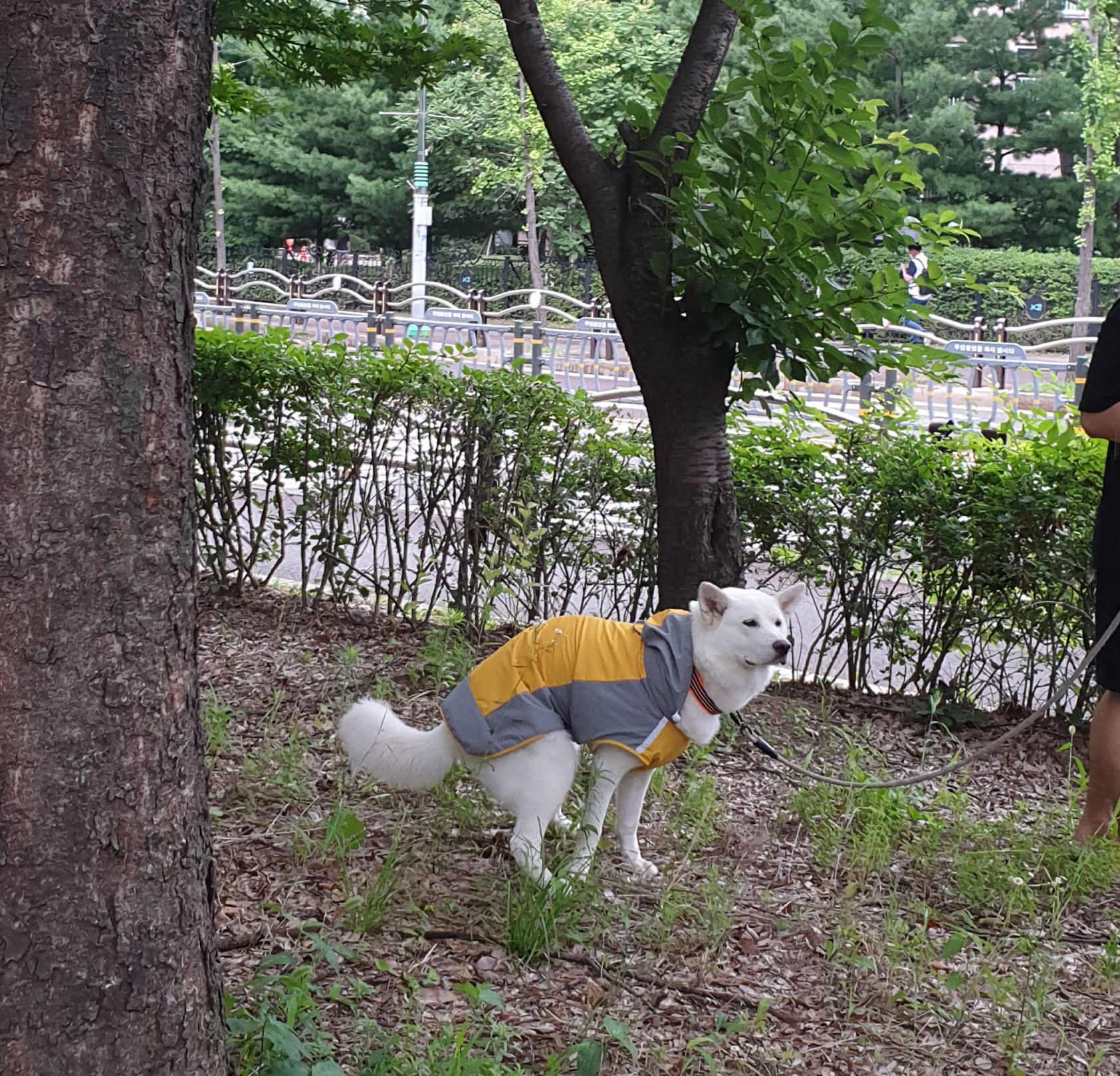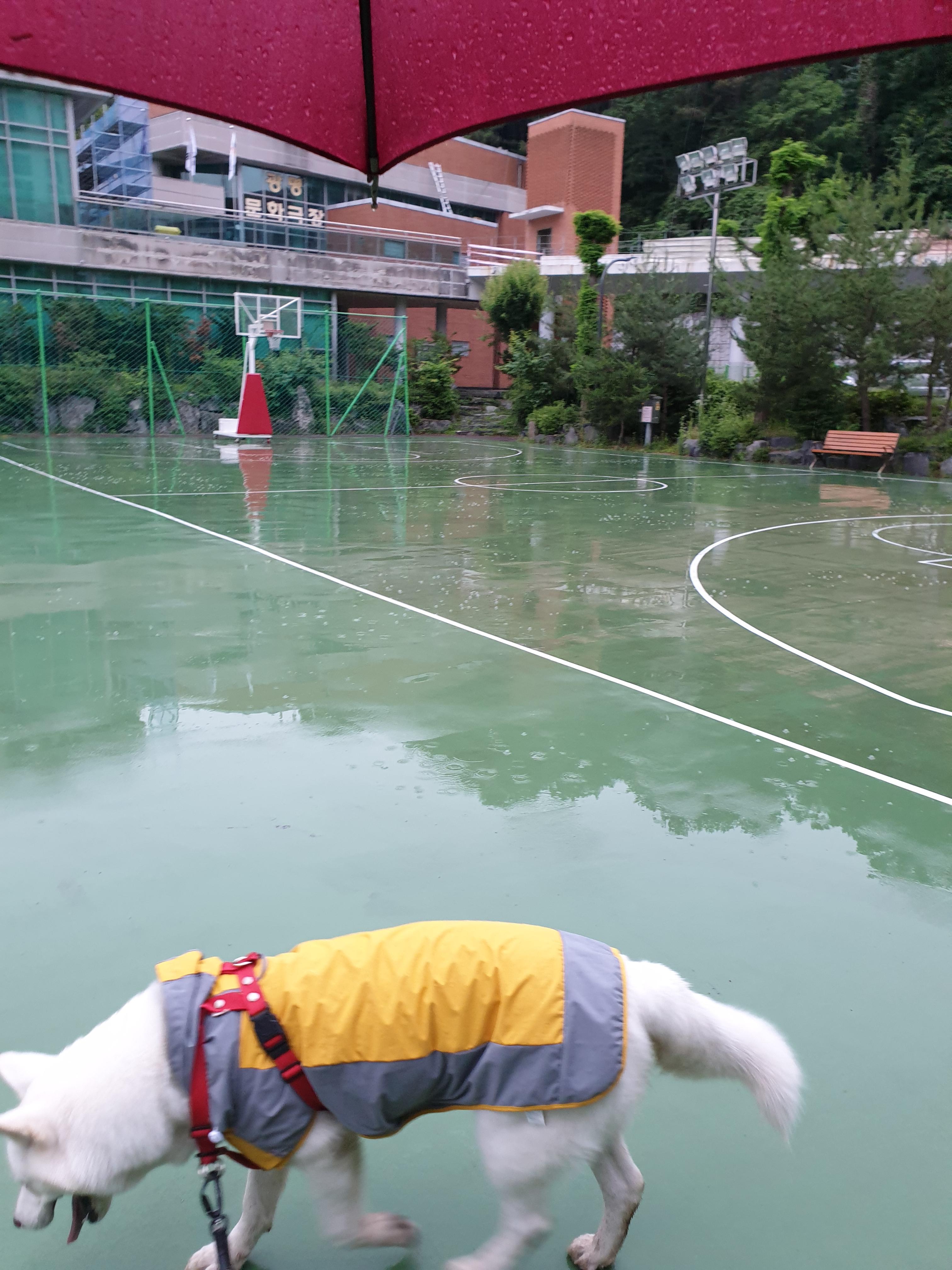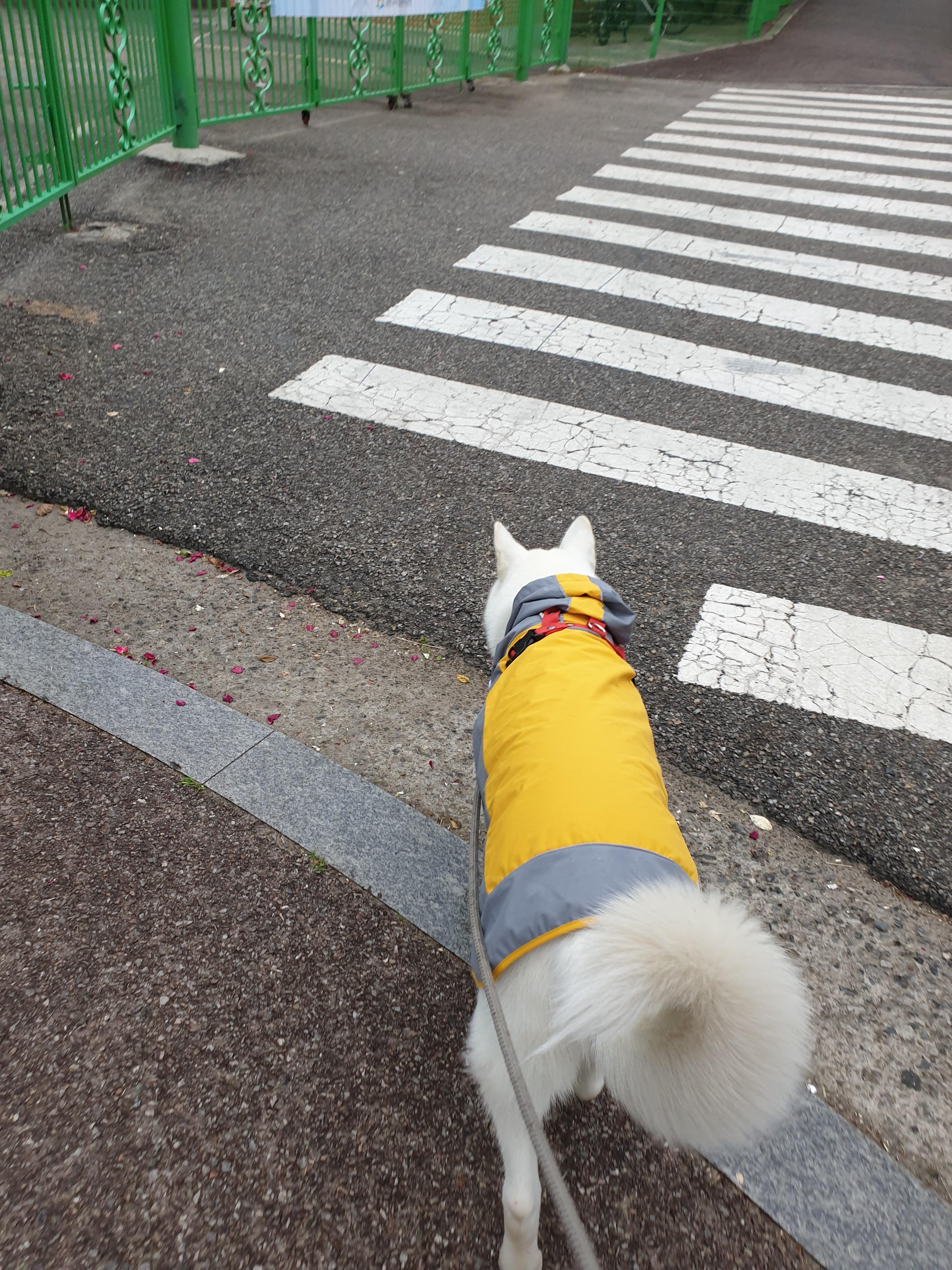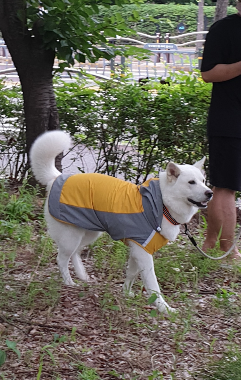사실 처음 입혔을 때도 엉덩이를 다 덮진 않았습니다. 위에 사진들이 우비 첫 개시 사진들입니다. 허나 설마 여기서 더 크겠어 하는 생각(당시 26kg)과 당장 비가 와서 우비를 입혀야하는 상황에 입히고 산책을 시켰어요. 강아지도 별다른 불편함 없어했구요.