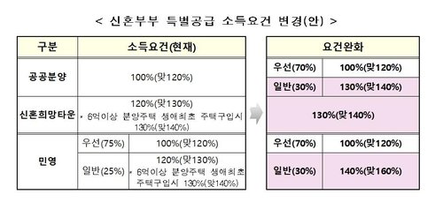 신혼부부 특공제도 개선 방안 발표에 따라 신혼부부 일반공급 비율과 소득요건이 더 완화되었습니다.