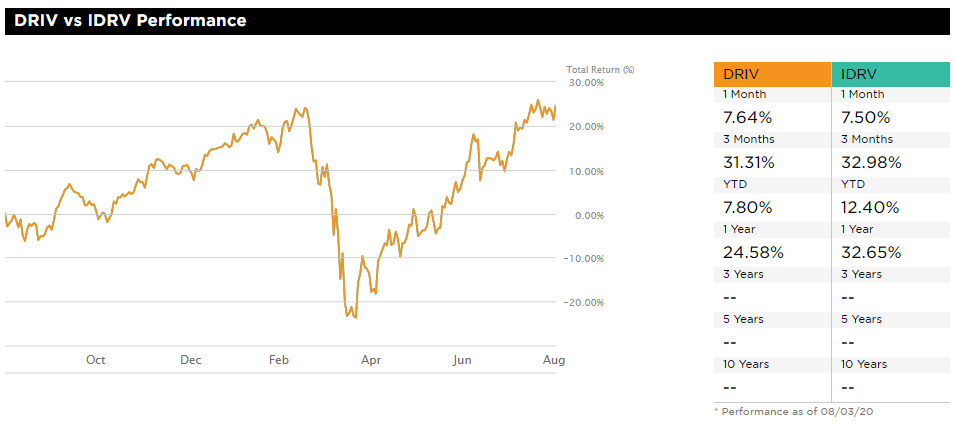 DRIV 주가 그래프입니다. ETF.COM에서 제공하는 IDRV의 그래프는 없네요ㅠㅠ. 하지만 오른쪽에 월, 분기, 연별 수익률을 보면 IDRV ETF가 더 좋은 성과를 올린 것을 볼 수 있습니다. 1년 수익률 기준으로 24.58%, 32.65%입니다.