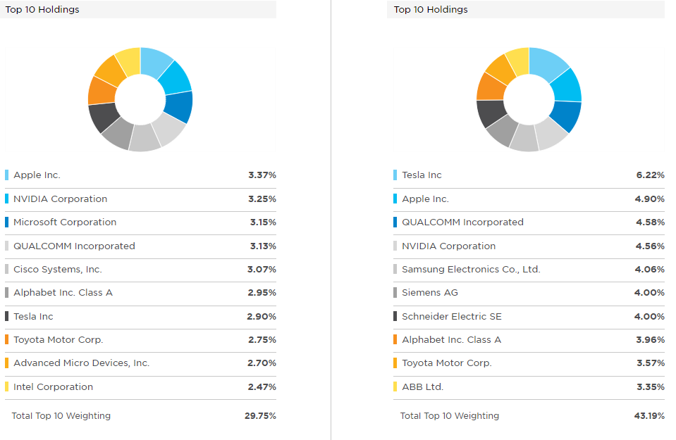 분산투자된 기업인데요. IDRV에서의 테슬라 비중(6.22%)이 더 높습니다. DRIV는 애플, 엔비디아, 마소, 퀄컴, 시스코, 구글, 테슬라, 도요타 등을 2~3% 비중으로 자잘하게 분산되었네요. IDRV는 테슬라, 애플, 퀄컴, 엔비디아, 삼성전자 순으로 4~6% 비중으로 분산되었구요. 두개의 ETF 모두 QQQ ETF의 느낌이 강하게 드는 것은 개인적인 생각일까요~.