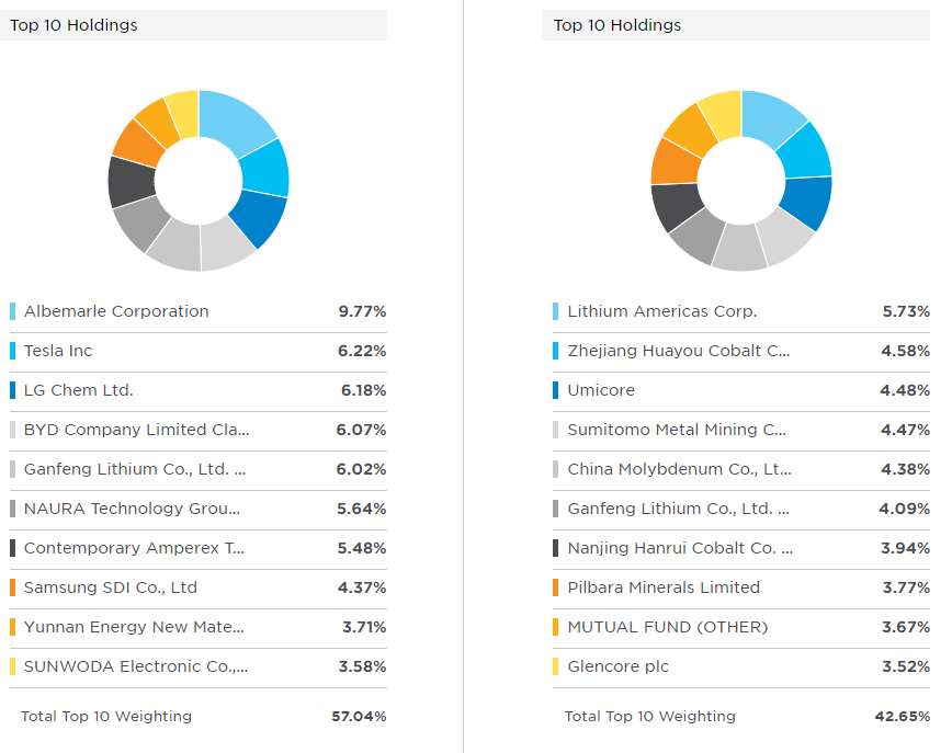 전기차 관련 ETF는 크게 두 가지로 구분할 수 있는데요. 전기자동차 필수 부품인 리튬과 배터리 공급 업체로 구성된 ETF와 전기차 완성차 공급 업체로 구성된 ETF입니다. 관련 자료는 www.etf.com에서 조사하였습니다.