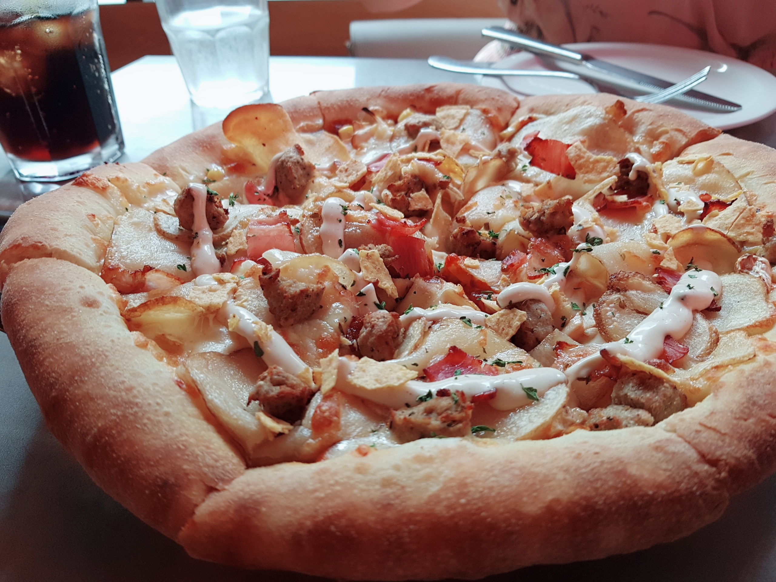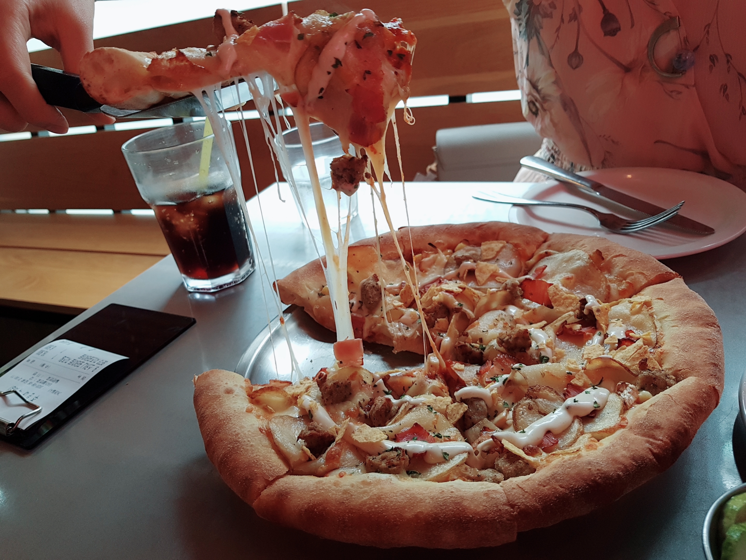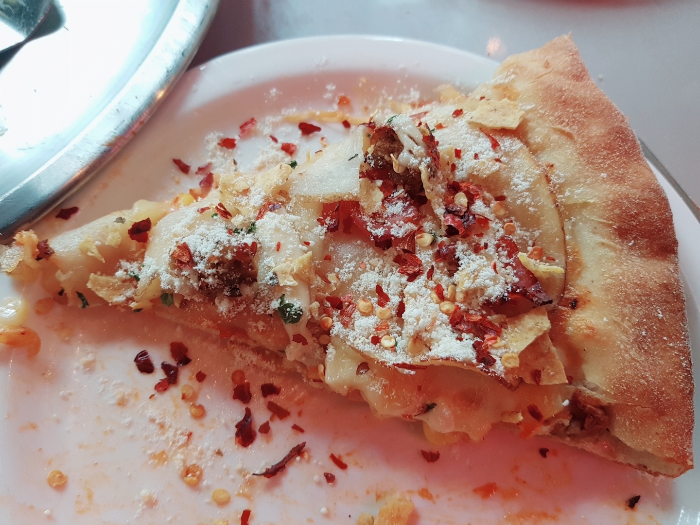 스키니 포테이토 피자가 나왔습니다. 이름이 왜 스키니 포테이토 피자인지 의아했는데 감자를 얇게 썰어 토핑 했기 때문이네요. 다른 체인 포테이토 피자는 보통 반달 모양의 감자 토핑인데 이 곳은 편 썰은 감자를 토핑 하고, 특이하게 나초도 얹어져 있어요.