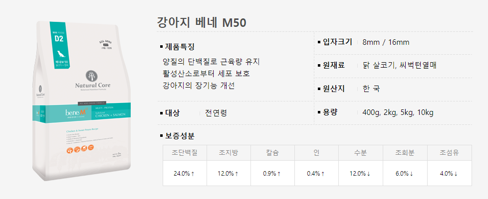 바로 네츄럴코어 강아지 베네 M50으로 변경했어요. 성분도 나쁘지 않아 보이고 홈페이지를 보니 엄선된 재료를 사용하여 사료를 만드는 것처럼 느껴졌습니다. 복실이에게 베네 M50를 처음 급여했을 때는 맛있어서 날뛰더군요. 근 한 달간은 사료를 주면 마파람에 게 눈 감추듯이 뚝딱 했습니다. 그 뒤로 슬슬 사료를 남기곤 했어요.