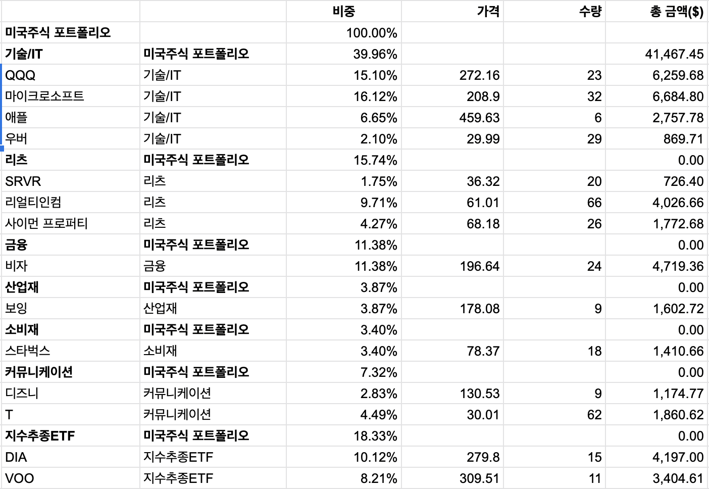 이렇게 완성된 스프레드시트입니다. 앞으로 추가 매수시에 수량만 수정해주면 알아서 보여줄 포트폴리오입니다. 만약에 새로운 종목을 매수한다면 살짝 손을 봐야 하긴 하지만요.