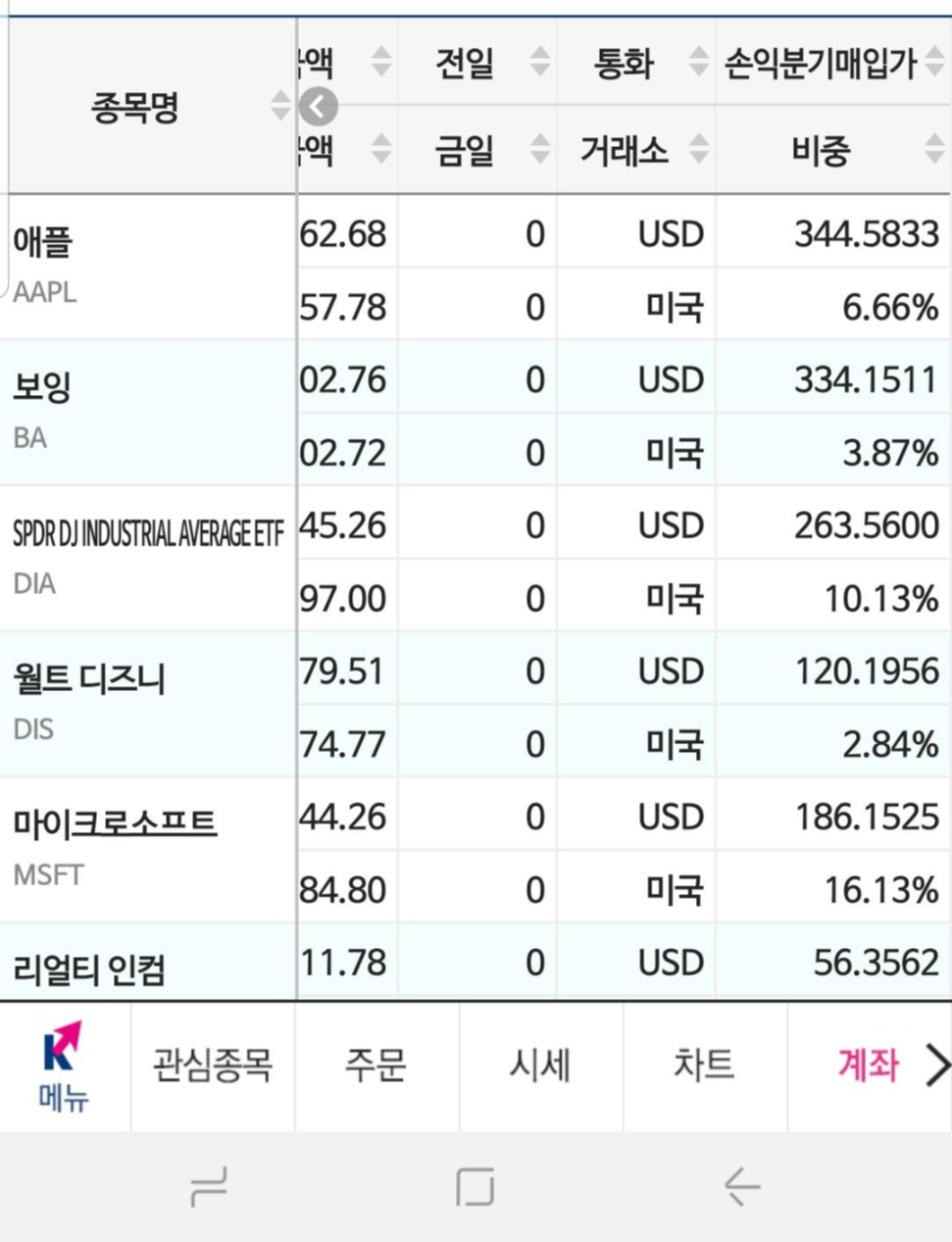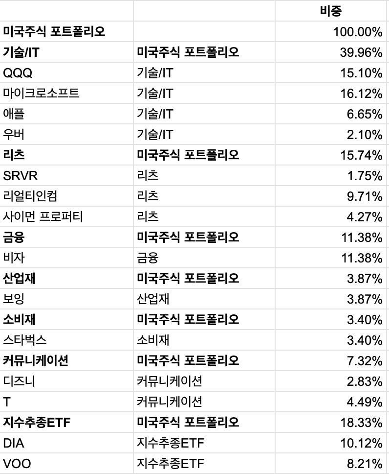 이렇게 보니, 제가 마이크로소프트에 대한 애정이 컸음을 알 수 있었어요. 종목 편애를 하니 제 계좌가 요즘 맥을 못추나봐요. 지수 추종 ETF는 업종간 분류가 불가하여 가운데에 배정하였습니다.
