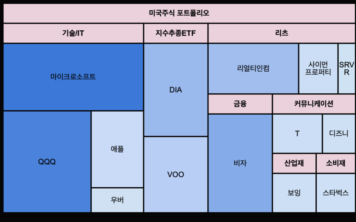 그리하여 제가 만든 도리댕댕 트리 맵 포트폴리오는 바로 위 차트입니다. finviz 버전에 비하여 다소 허접하지만 한눈에 볼 수 있는 점에서 닮았다고 위안 삼습니다^^ 저는 finviz와 같이 산업 별로 카테고리화 하였는데요. 배당주/성장주로 나눌 수도 있지만 요즘엔 그 경계가 모호하다고 생각했기 때문이에요. 비중이 큰 종목일수록 파란색, 적을수록 하늘색으로 구성해보았습니다.