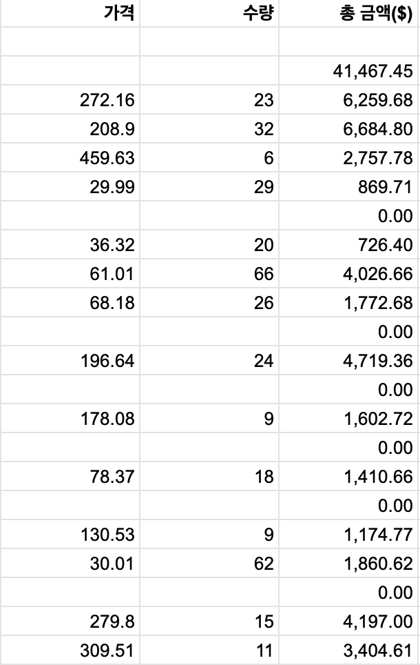 참고로 위 스프레드시트에 적혀있는 투자금액은 실제 투자금액과는 다릅니다. 수량을 적나라하게 적기 민망하여 수정해 올린 것입니다. 읽어주셔서 감사합니다.
