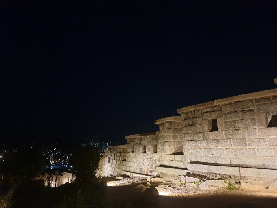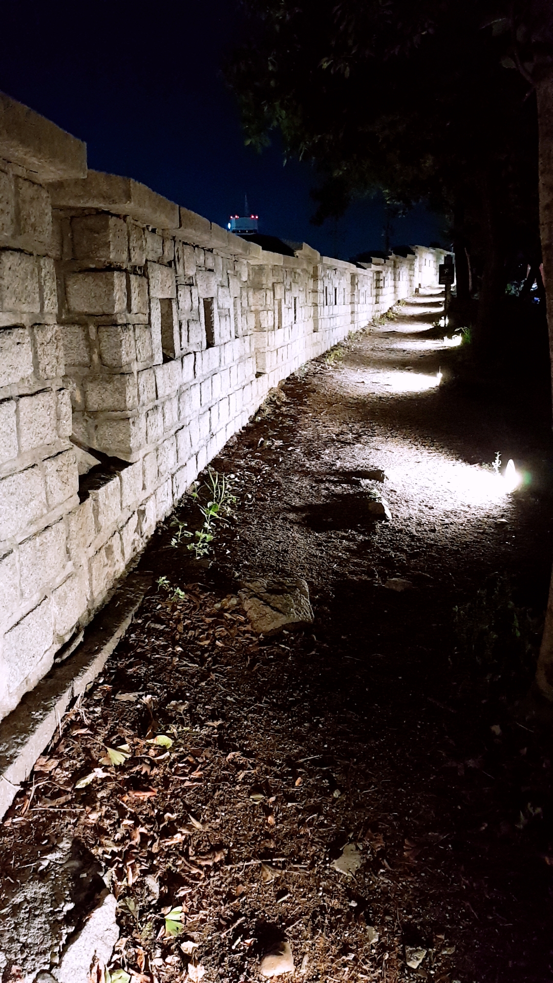 바닥에서 노란빛의 은은한 간접조명이 직사각형 벽돌로 차곡차곡 쌓인 키높이의 성벽을 비추고 있었습니다. 과거와 현재가 만나 운치 가득한 분위기를 풍기는 모습에 넋이 나갈 수 밖에 없더군요....진심으로 아름다운 성곽길이었습니다. 저희 커플은 어느새 사진 어플을 켜서 이리저리 성곽을 배경으로 셔터를 눌러댔습니다ㅎㅎㅎ