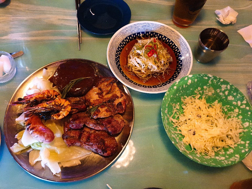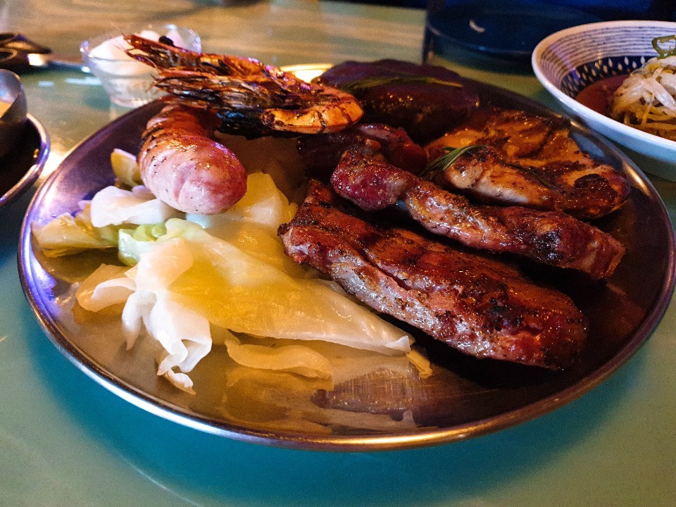 애석하게도 메뉴판 사진을 찍지 못했네요...ㅠ.ㅠ 저희 커플은 다양한 고기를 맛보기 위해 모듬바베큐 중자(28,0)를 주문하였습니다. 입가심으로 먼저 나온 양배추샐러드를 냠냠하는 도중에 숯불에 구워진 통삼겹, 닭다리살, 수제 함박과 소세지, 새우구이가 한 접시에 풍성하게 등장하였습니다!! 추가로 숙주샐러드가 같이 나왔는데 고기와 곁들여 먹는 맛이 정말 별미였습니다.