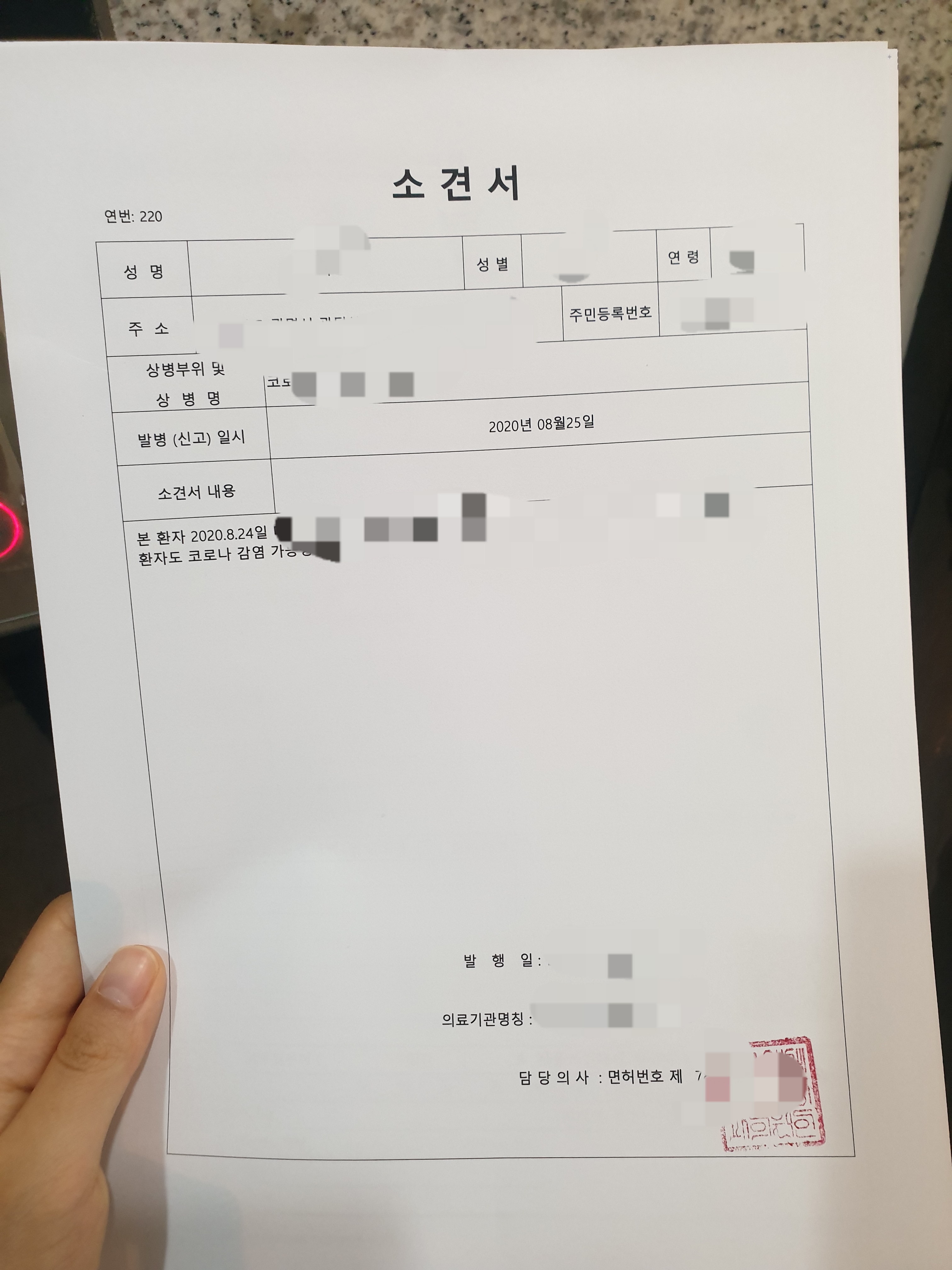 열은 서서히 떨어지긴 했지만, 정상 체온은 아니었기 때문에 병원에 가서 진료를 받았습니다. 물론 이해는 가지만 저를 앞에 두고 엄청난 방역 활동을 하시더군요. 벌써부터 제가 코로나 확진자가 된 느낌이었어요. 진료한 의사도 제가 기침이나 코감기 증상이 없으니 입과 코를 보시지도 않으시고 원하면 소견서를 써주겠다는 반응이셨습니다.