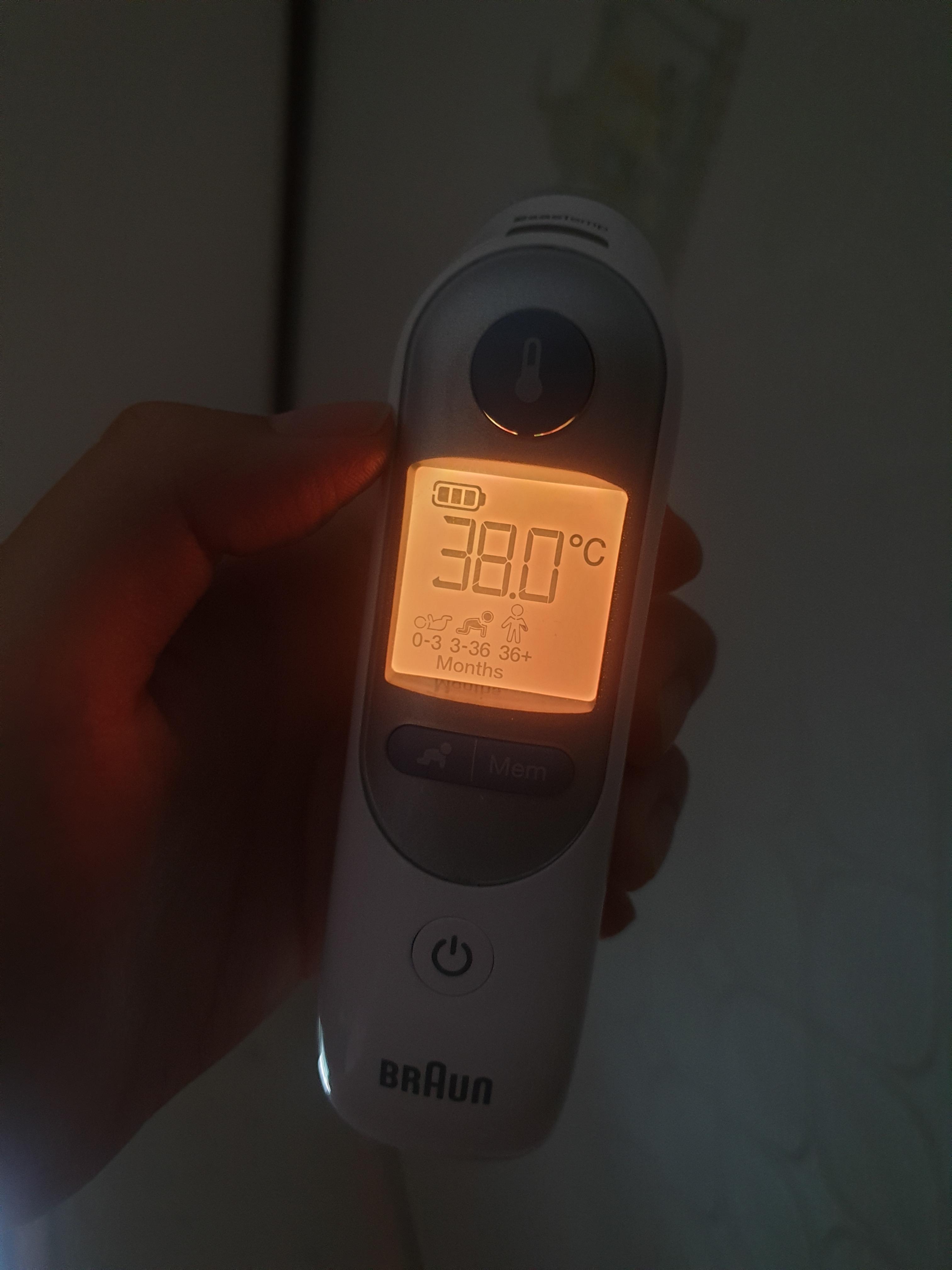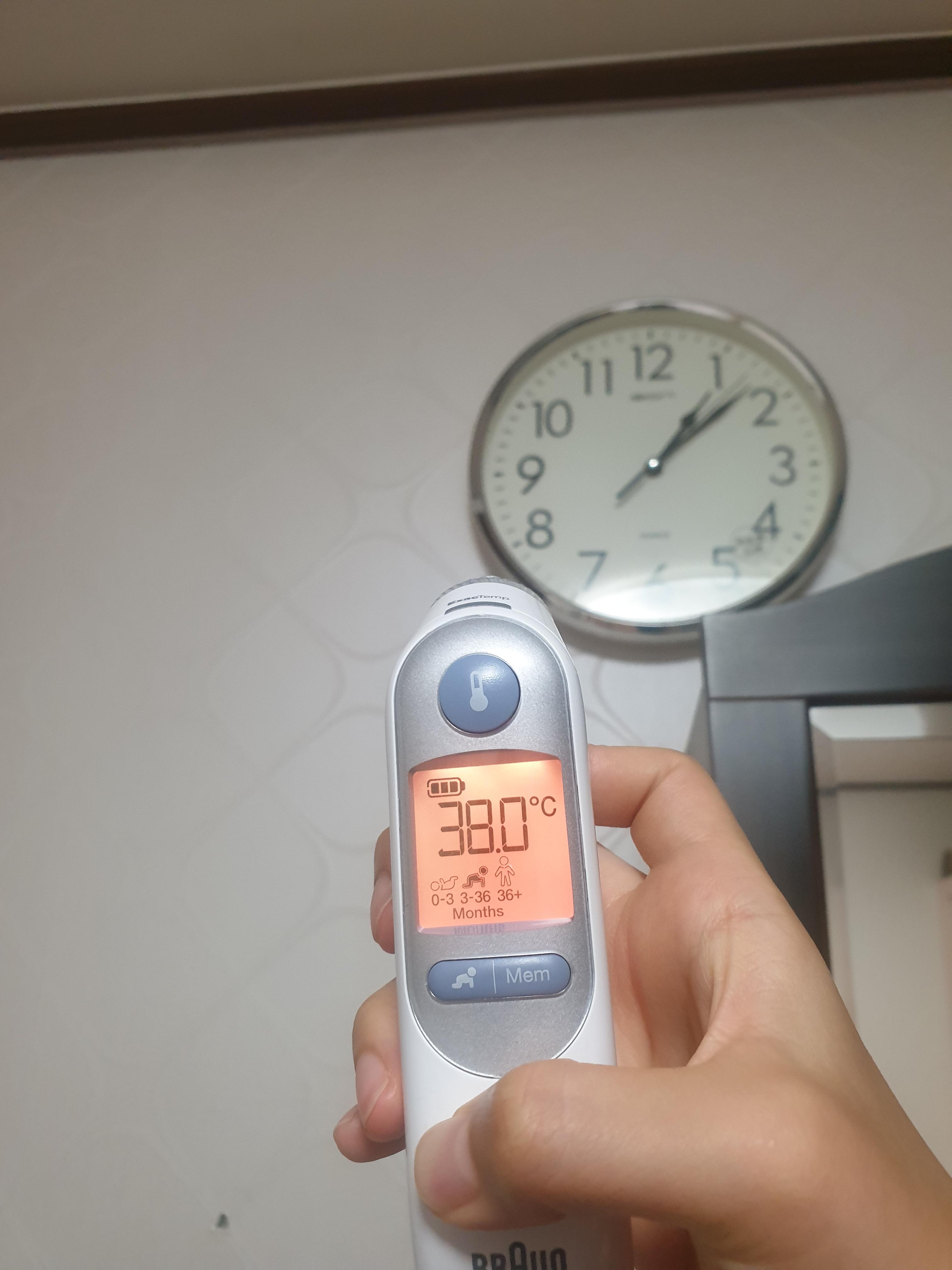 점점 열이 올라갔을 때는 38.5도였는데, 새벽 1시가 지난 시점에는 38도였고, 아침에 일어나서 체온을 재봐도 38도였어요.