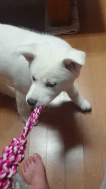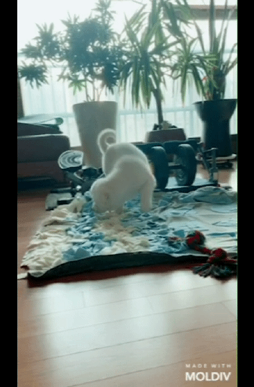 왼쪽 움짤처럼 슬라이딩 하는 경우도 있었고, 오른 쪽 움짤처럼 터그놀이를 할 때 간혹 중심을 잡지 못할 때가 있었답니다. 시리가 점점 크면서 미끄러운 정도가 점차 심해지더라고요. 터그놀이를 할 때 발에 중심을 잘 못 잡으니 이제 엎드려서 터그놀이를 하기도 하더군요. 질질 끌려다니는 시리를 보면서 우리 집에도 이제 미끄럼방지 매트를 깔아야 할 시간이 왔구나 싶었어요.