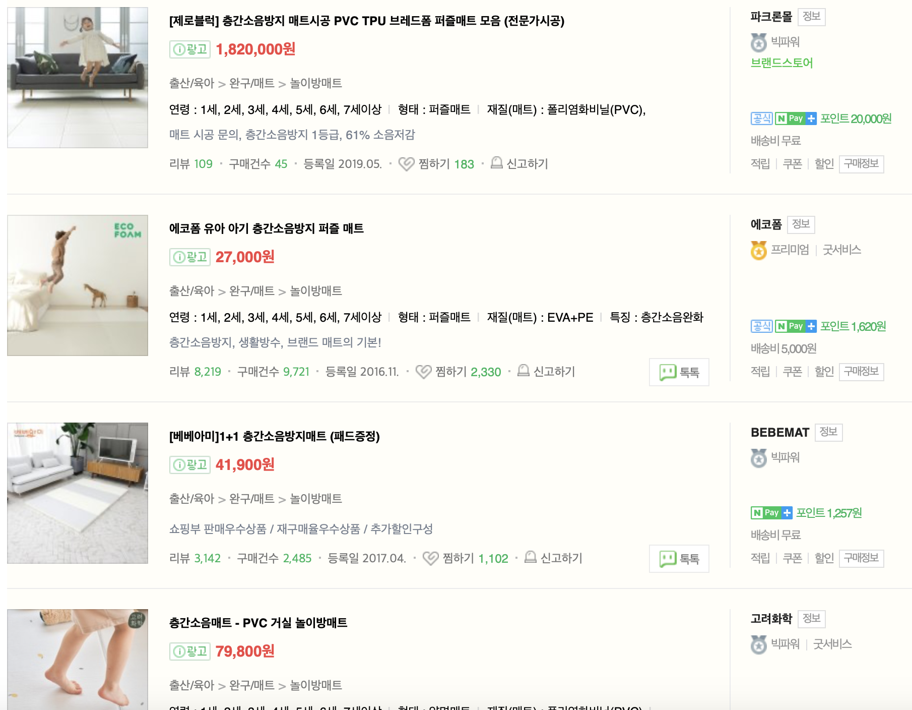 층간소음매트 역시 이렇게나 많은 회사에서 판매하고 있더라고요. 요즘 층간소음으로 인한 갈등이 화두가 되어 수요에 따른 공급이 이렇게나 많다는 걸 느꼈습니다. 층간소음매트가 일반적으로 아이들이 놀이방이나 집에서 신나게 놀 때 생기는 소음이 많아 유아 매트와 유사한 형태였습니다. 따사룸, 파크론 등 층간소음매트 판매처에서 반려동물 미끄럼방지매트를 파는 곳도 굉장히 많았고요.