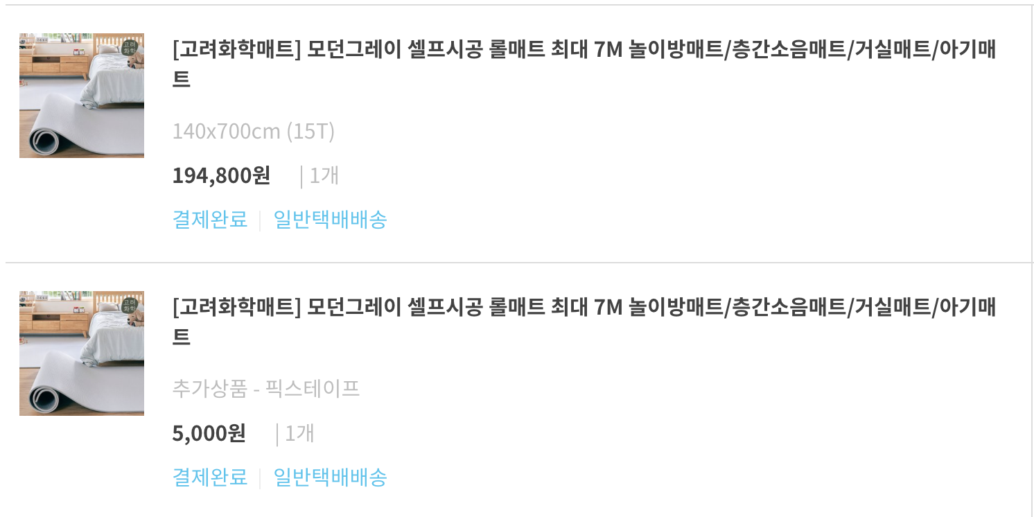 층간소음방지매트 후보군은 따사룸, 고려화학매트, 삼바텍의 롤매트였습니다. 동상이몽에 나온 소이현 매트도 찾아보았는데 크기가 애매해서 셀프시공이 가능한 것으로 골랐고요. 1.4m*7m를 반으로 자르면 2.8m*3.5m로 저희 집 거실에 알맞는 크기가 나올 것 같아 고려화학매트 롤매트 당첨!