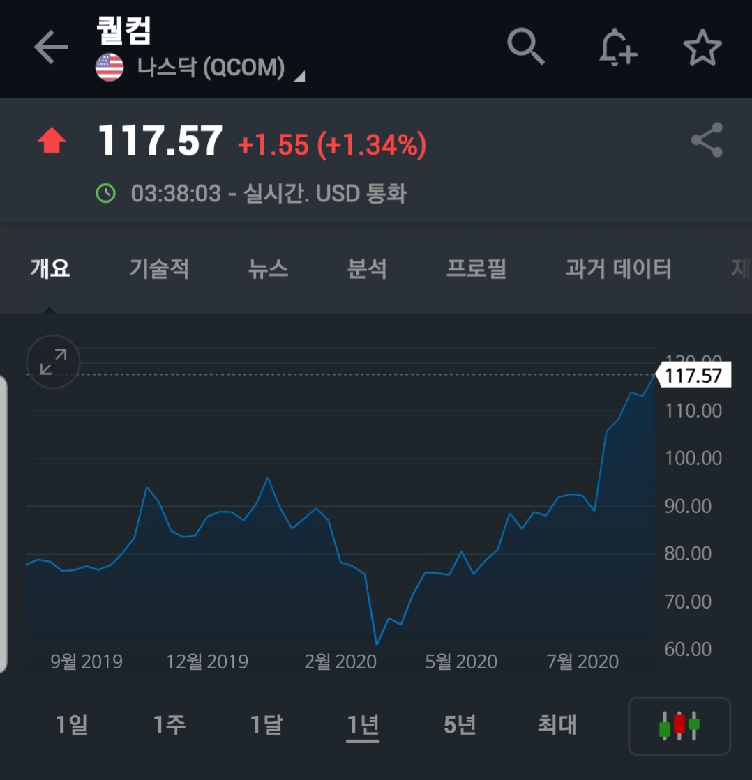 68퍼센트의 수익률로 기쁜마음으로 매도했던 퀄컴은 팔지 않았더라면 거의 120% 수익률을 경신했겠지요.